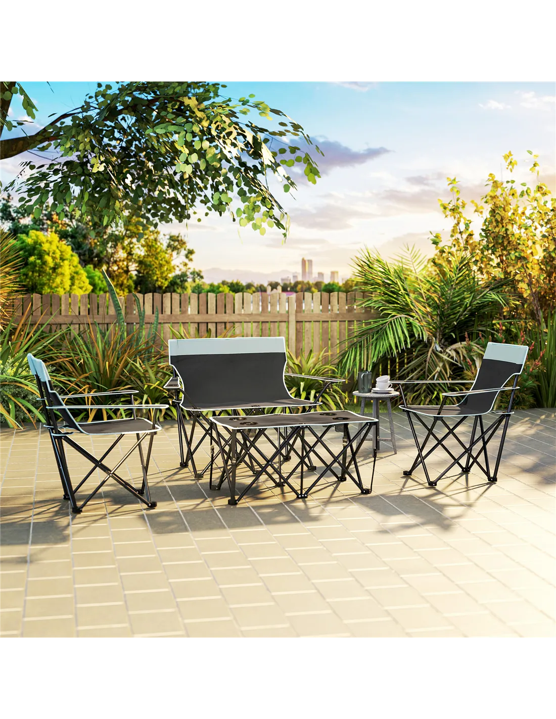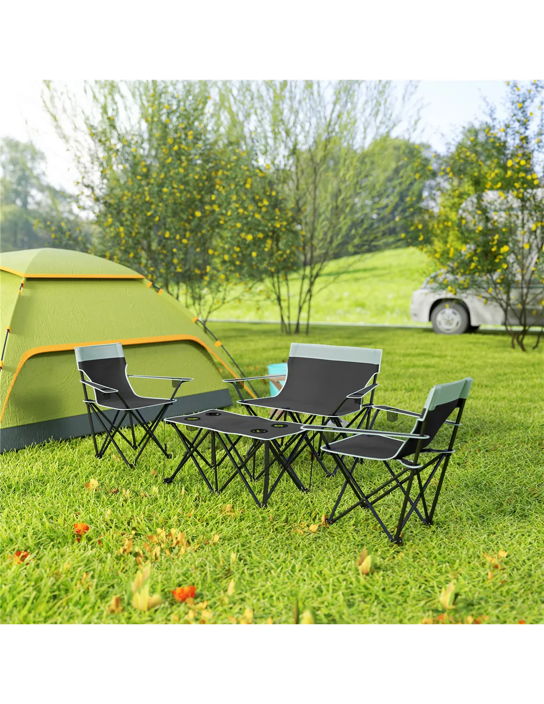 Bringing everyone together during outdoor trips is easy, with this Outsunny camping table and chairs set. It comes with two single chairs, a double chair and a foldable table. There are mesh cup holders in all arms and the table, offering a handy, close-by place for drinks and more.