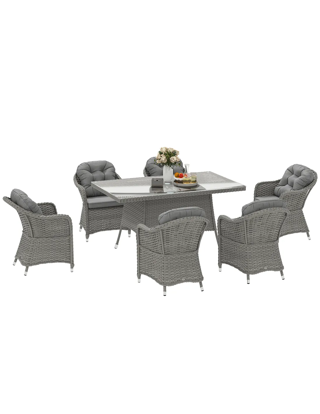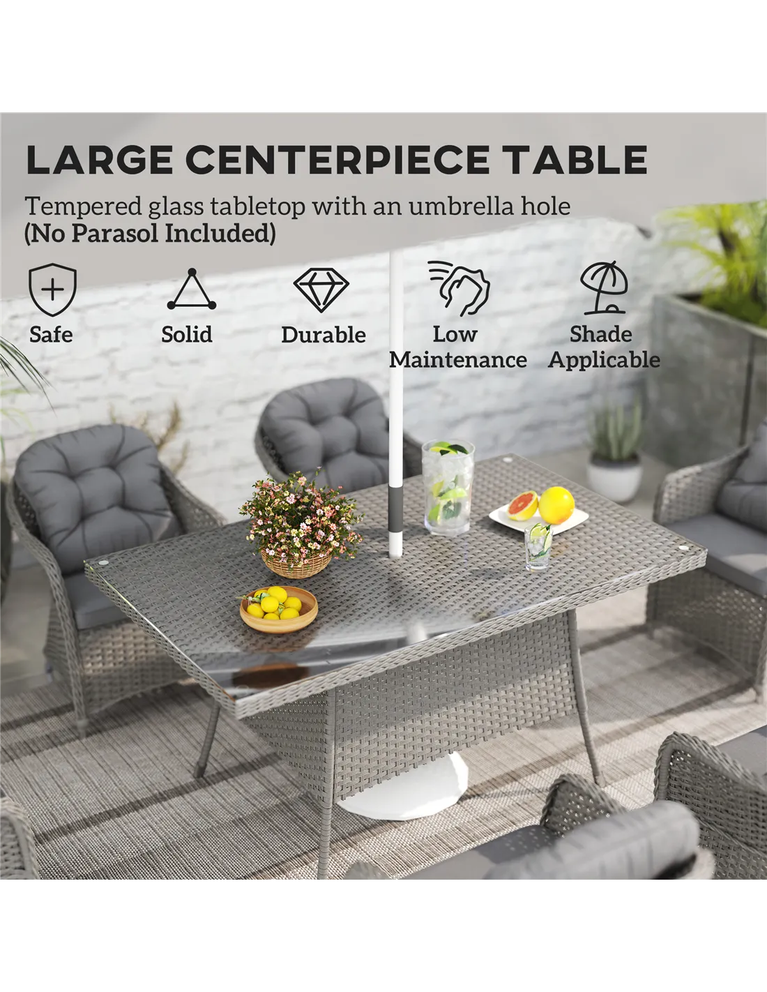 Bring everyone together outside, this season and beyond, with this Outsunny rattan garden furniture set. Includes six chairs and a large table - plenty of space for your favourite company. Each piece is made from powder coated aluminium for a strong core, wrapped in durable and stylish plastic wicker - a protective rattan shell. Keep safely shaded, thanks to the parasol hole in the glass-top table.