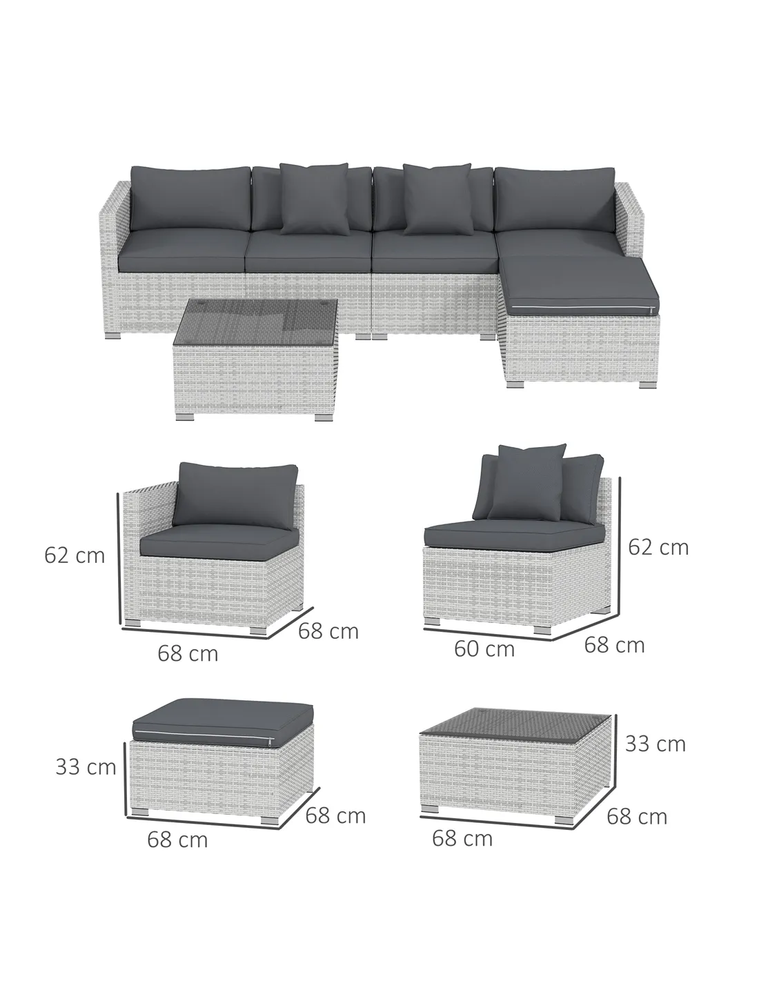 This 6 PCS outdoor corner sofa from Outsunny made with a metal construction and PE rattan. The garden sofa set comes with thick soft padded cushion allows you comfortable lying and sitting. The table of the outdoor furniture completes with a 5 mm transparent glass top, great to place your drinks. The seating and backrest cushions are fireproof for safety and flame retardant. This is an excellent set to have in your garden or conservatory and it is a great place to relax and entertain.