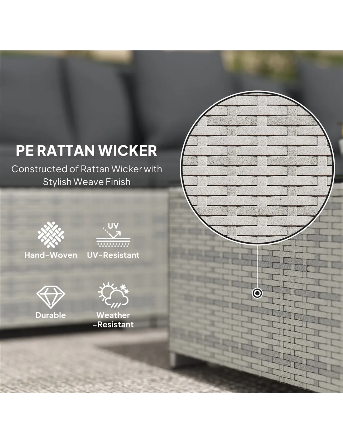 The set is crafted from weather-resistant PE rattan and includes fireproof cushions, making it suitable for typical UK outdoor environments when properly cared for.