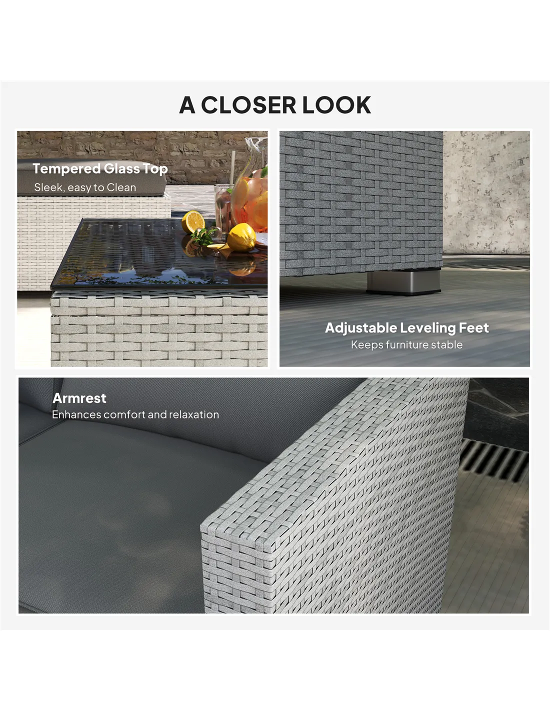 The Outsunny 6 Pieces Rattan Corner Sofa Set in Mixed Grey is perfect for enhancing any outdoor or indoor relaxation space. Ideal for British gardens, patios, conservatories, or sunrooms, this set creates a cosy corner for socialising or unwinding. Arrange the modular pieces to suit your space, whether for intimate family gatherings or entertaining guests. The durable PE rattan and weather-resistant cushions ensure comfort and style throughout the seasons. Use the tempered glass coffee table to serve refreshments or display decorative items, adding a touch of elegance to your outdoor living area.