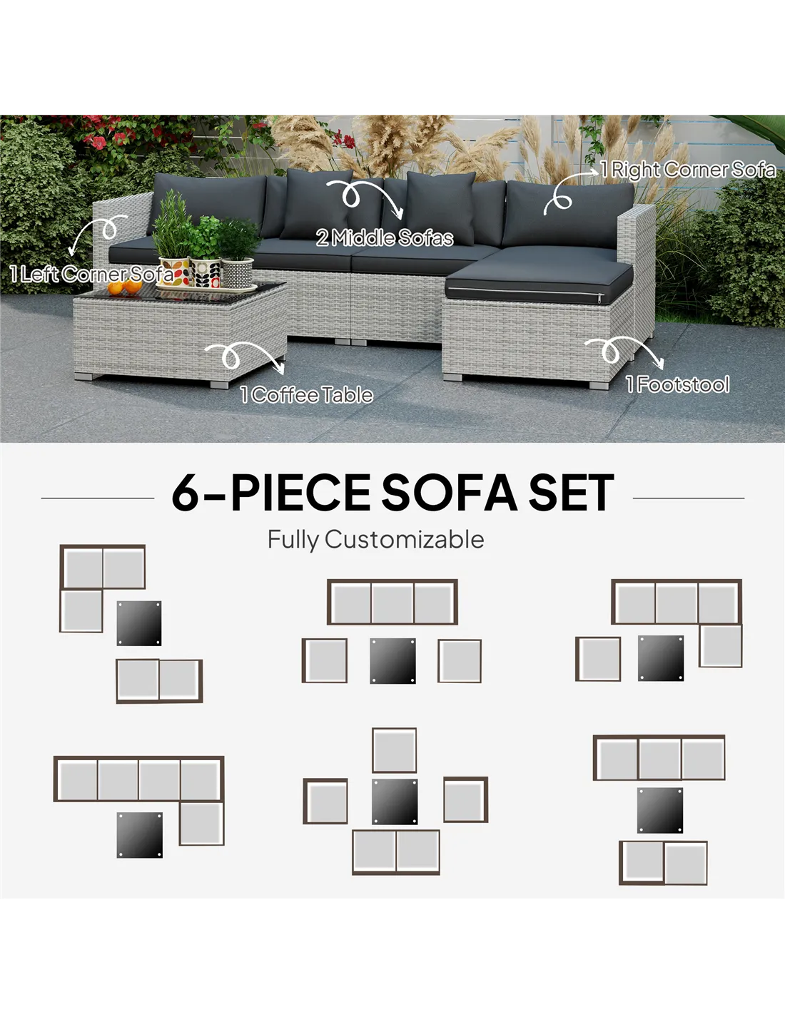 Outsunny 6 Pieces Rattan Corner Sofa Set - Mixed Grey