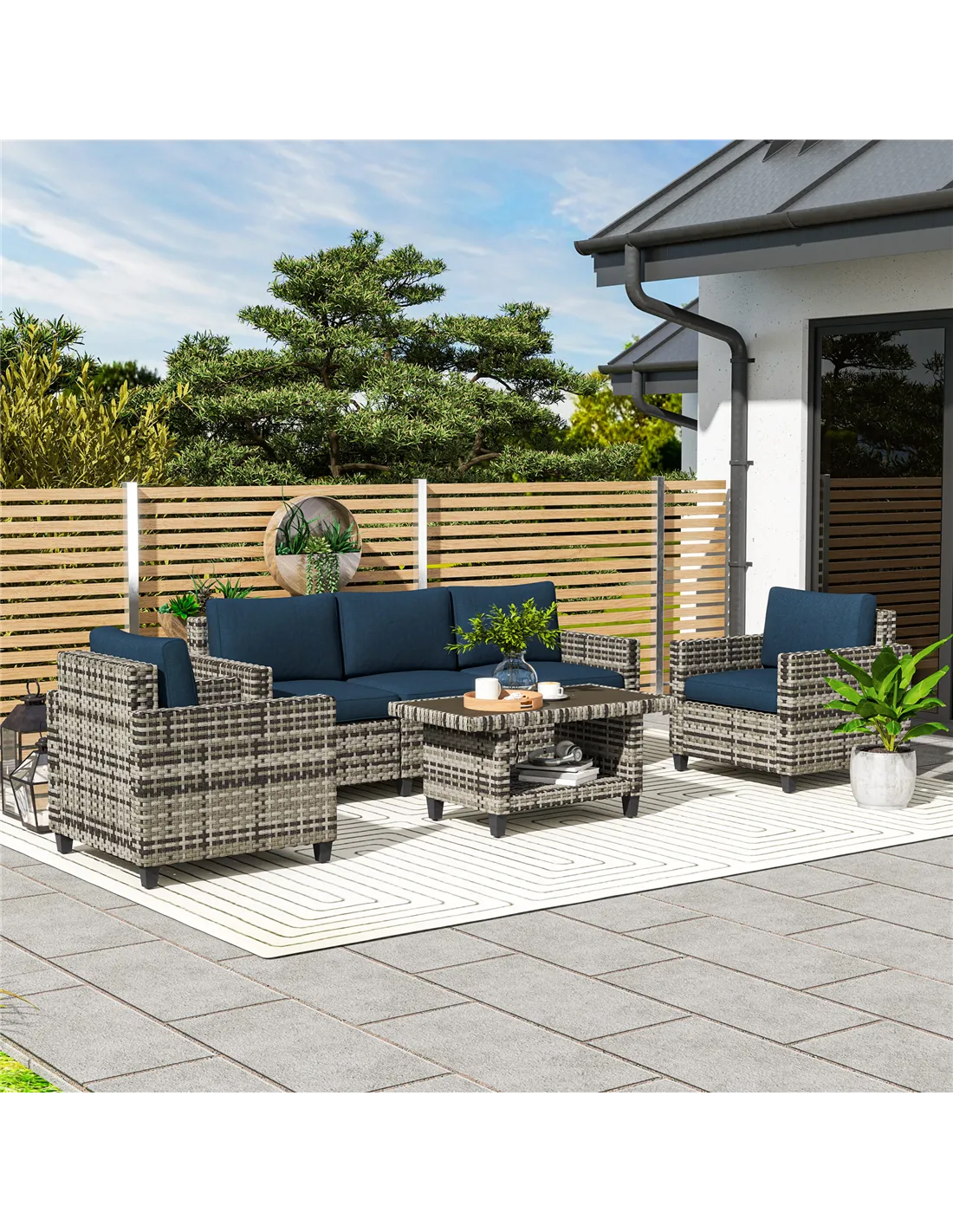 Outsunny Six-Piece Modular Rattan Sofa Set - Navy Blue