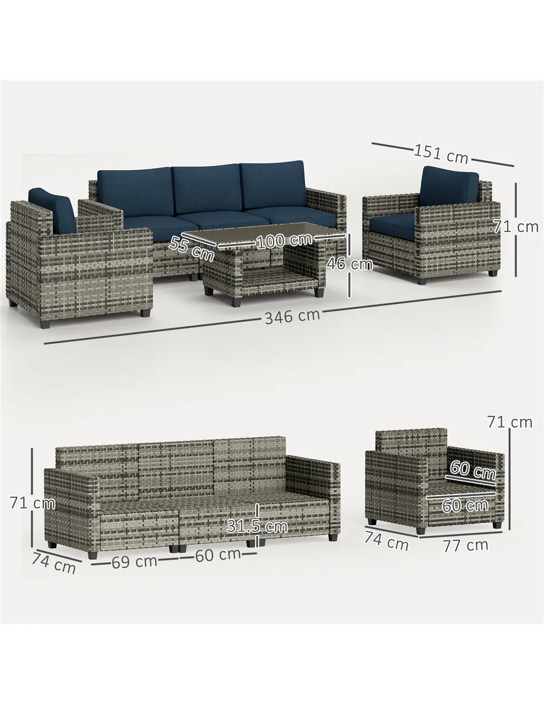 Favourite company gathers round and relaxes in comfort, with this Outsunny six-piece garden sofa set. It comes with two corner chairs, a middle chair, two armchairs and a coffee table - a modular set so you can fix to any shape or position you want. Powder coated steel frames mean a strong core, wrapped in plastic wicker for a stylish and robust rattan look. Complete with seat and back cushions for comfort.
