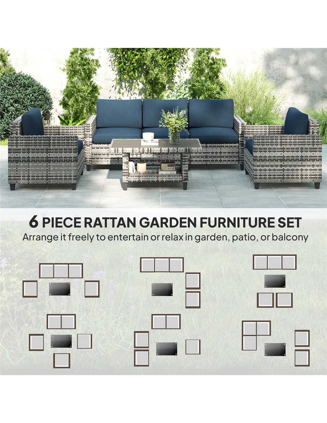 The Outsunny six-piece modular rattan sofa set in navy blue is perfect for creating a versatile and inviting outdoor seating area. Whether you’re hosting a summer garden party, enjoying a quiet afternoon with a book, or relaxing with family and friends, this set adapts effortlessly to your space. Its modular design allows you to arrange the two corner chairs, middle chair, and armchairs into various configurations to suit patios, balconies, or conservatories. The two-tier coffee table provides ample room for drinks and snacks, making it ideal for alfresco dining or casual entertaining. Thanks to its durable steel frame and weather-resistant PE rattan, this set withstands the unpredictable British climate while maintaining a stylish appearance.