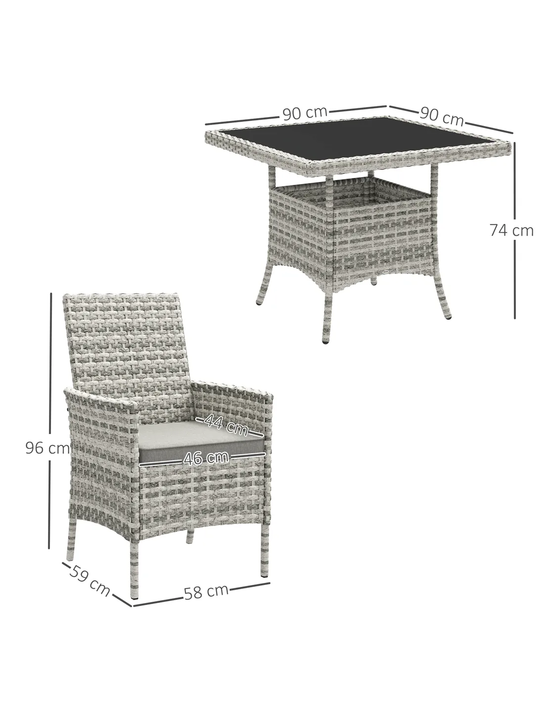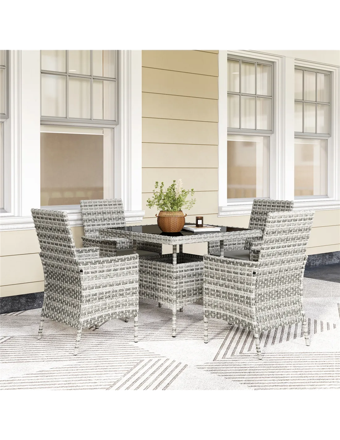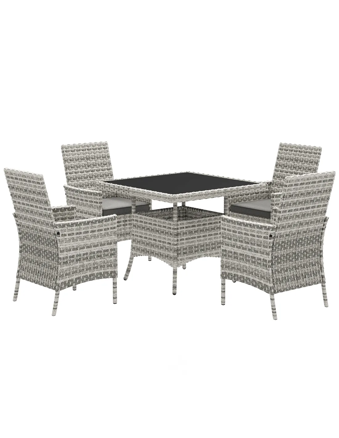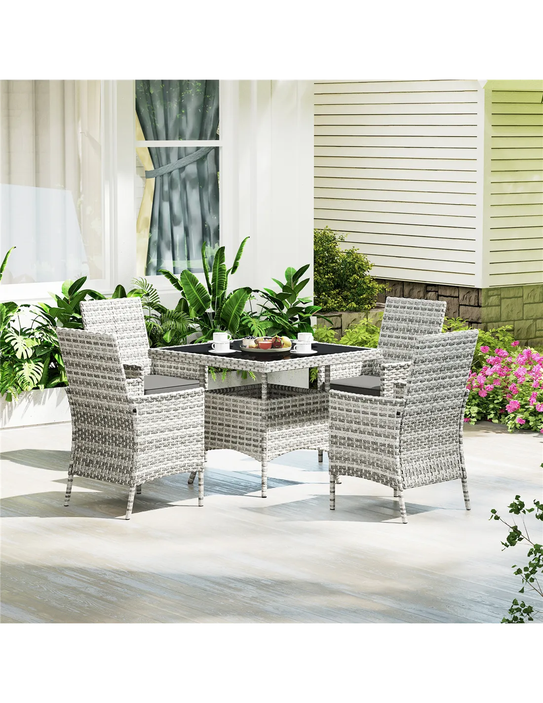 Outsunny Rattan Garden Furniture Set, Outdoor Dining Table and Chairs 4 Seater with Cushions, Square Tempered Glass Top, 4 Armchairs, for Balcony, Terrace, Conservatory, Mixed-Grey