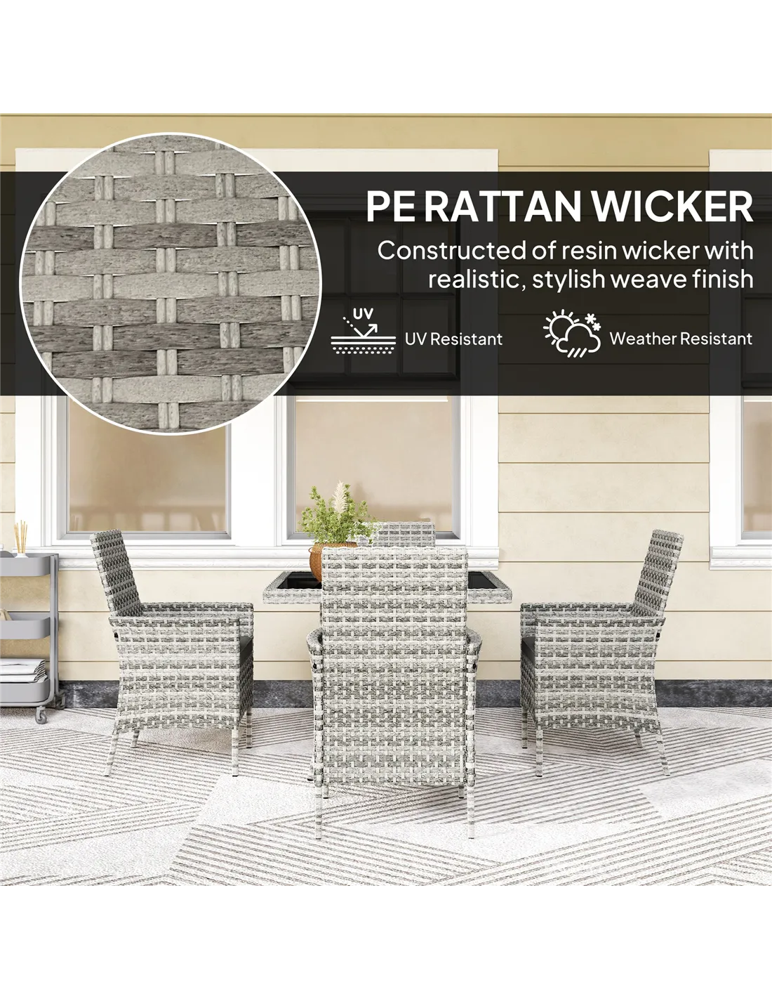 Enjoy alfresco dining with the Outsunny rattan dining set, a charming addition to any outdoor space. This 5-piece garden dining set, featuring four cosy chairs with washable cushions and a sleek table, promises comfort and style. Crafted from all weather double-strand half-round PE rattan with a robust steel frame, it's designed to weather the elements, making it a staple for any garden table and chairs collection.