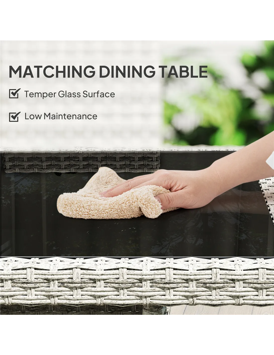 - Material: PE Rattan, Steel, Fibre cloth, Tempered glass, 3D vertical cotton