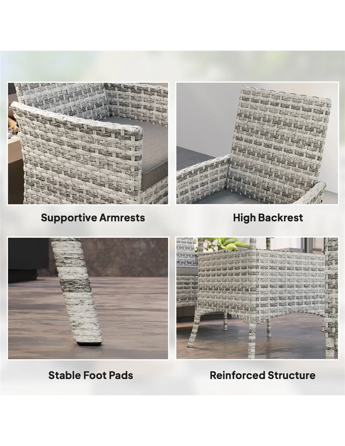 The Outsunny rattan garden furniture set is perfect for creating a cosy outdoor dining area on your balcony, terrace, or conservatory. Its compact four-seater design fits comfortably in smaller spaces, making it ideal for urban gardens or patios. The mixed-grey tones blend effortlessly with natural surroundings and modern décor alike. Use it for casual family meals, weekend brunches, or evening drinks with friends. Thanks to the tempered glass tabletop and washable cushions, it’s equally suited for alfresco dining or relaxing with a book and a cup of tea. The sturdy steel frame and weather-resistant PE rattan ensure this set remains a stylish and practical feature throughout the seasons.