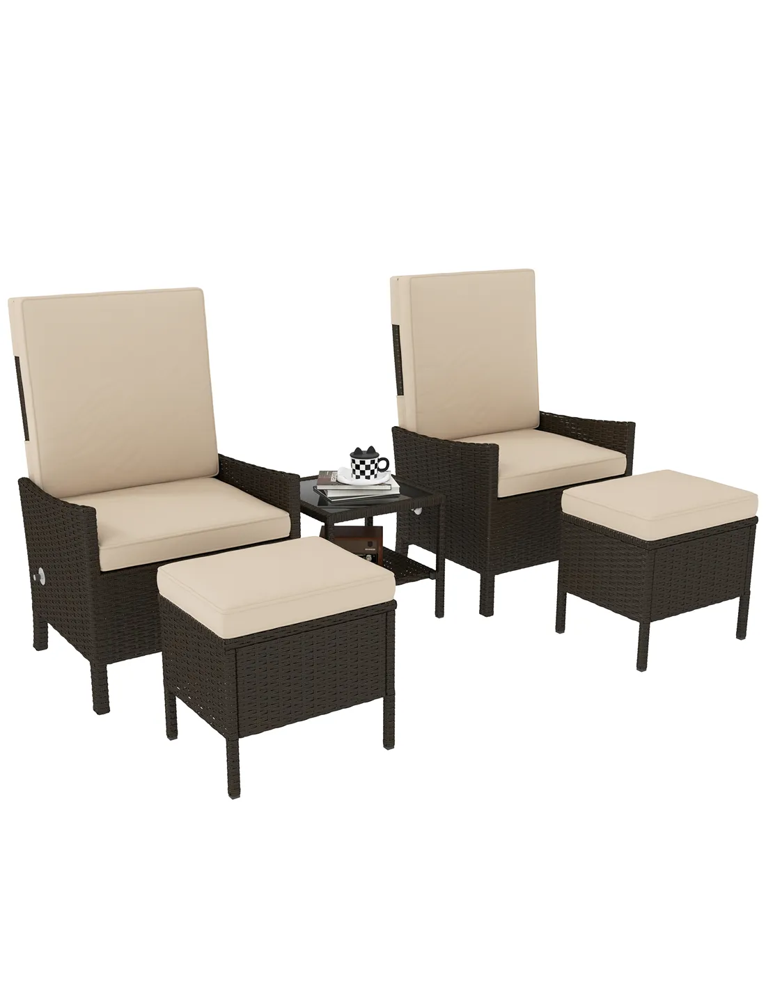 The Outsunny 5-Piece Rattan Garden Furniture Set includes two reclining armchairs, two footstools and a two-tier coffee table. The armchairs feature adjustable backrests and washable cushions, while the coffee table provides extra storage with a tempered glass top. Built with UV-resistant rattan and a rust-resistant steel frame, it offers durability and comfort. Great for any outdoor space, this set combines style, comfort and long-lasting quality.