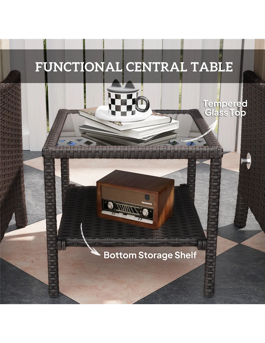 - The two-tier glass coffee table offers practical space for drinks, snacks, or decorative items, making it great for alfresco dining or entertaining guests.