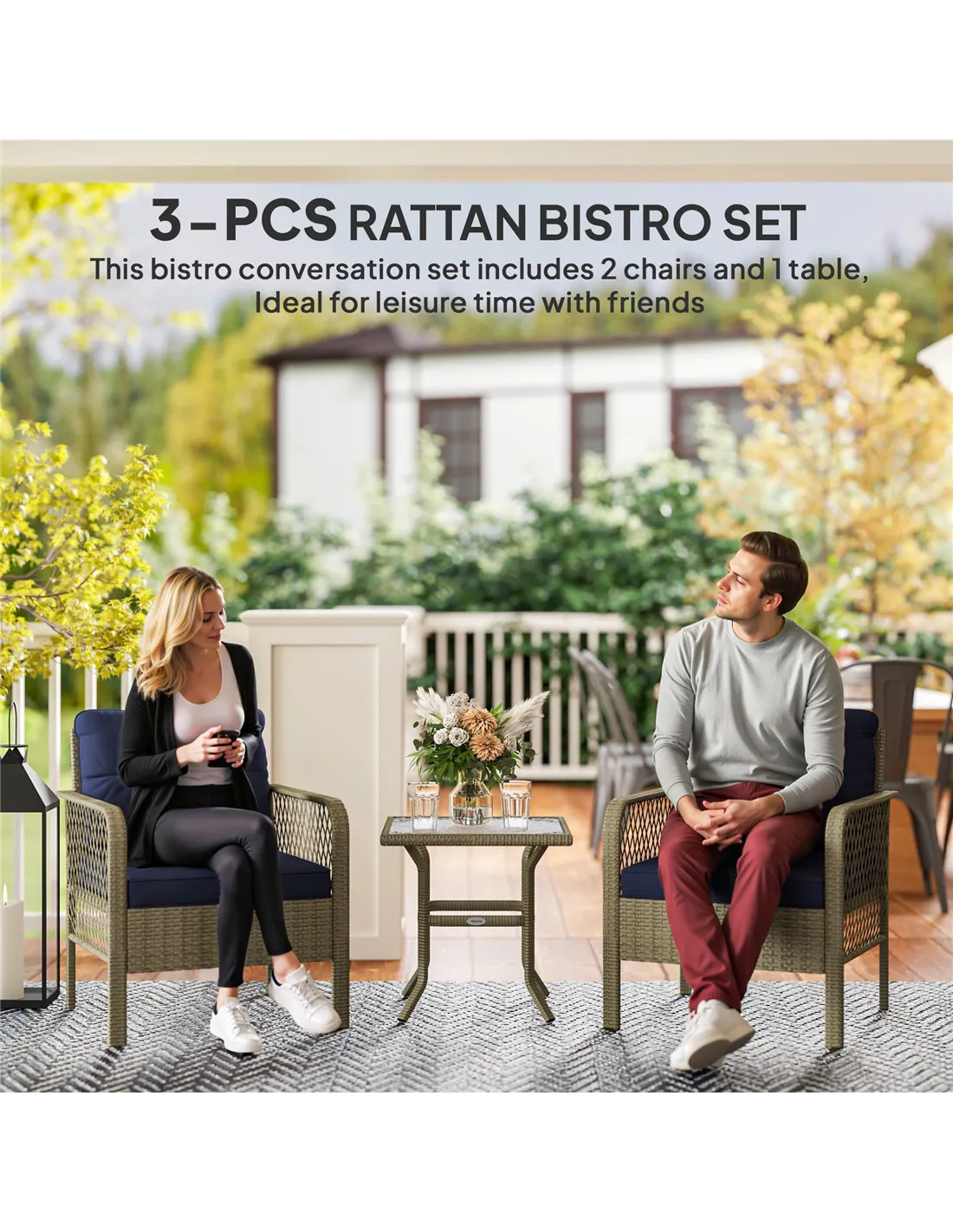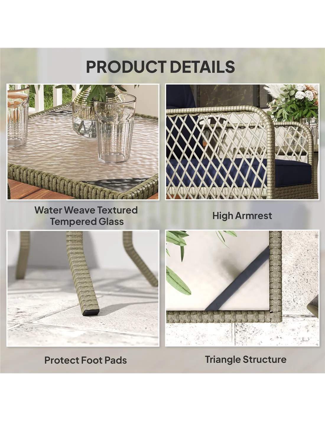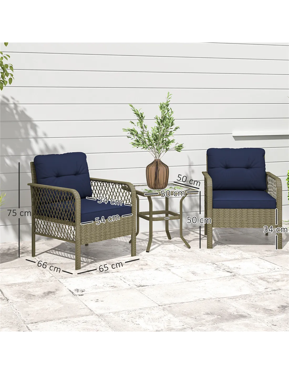Outsunny 3 Pieces Rattan Bistro Set with Glass Top Coffee Table, Chairs and Cushions for Outdoor, Patio, Balcony, Charcoal Grey