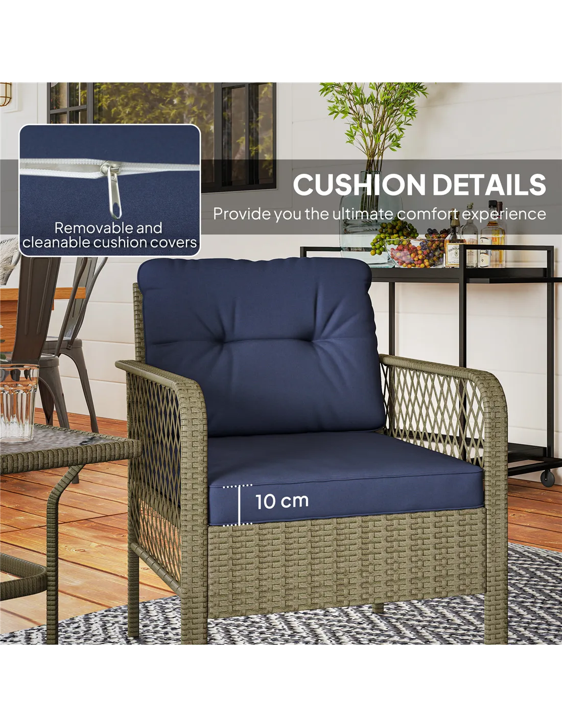 Start the season off the right way - do it with this three-piece garden set from Outsunny. Formed of two armchair-seats and a matching table, you can easily enjoy the sun with a friend. Metal forms a strong frame for all pieces, where PE wicker is wrapped around for an on-trend rattan look. The table is fitted with a tempered glass top for a solid and safe holding place. Both chairs come with thick padded cushions - simply sit down and enjoy the fresh air.