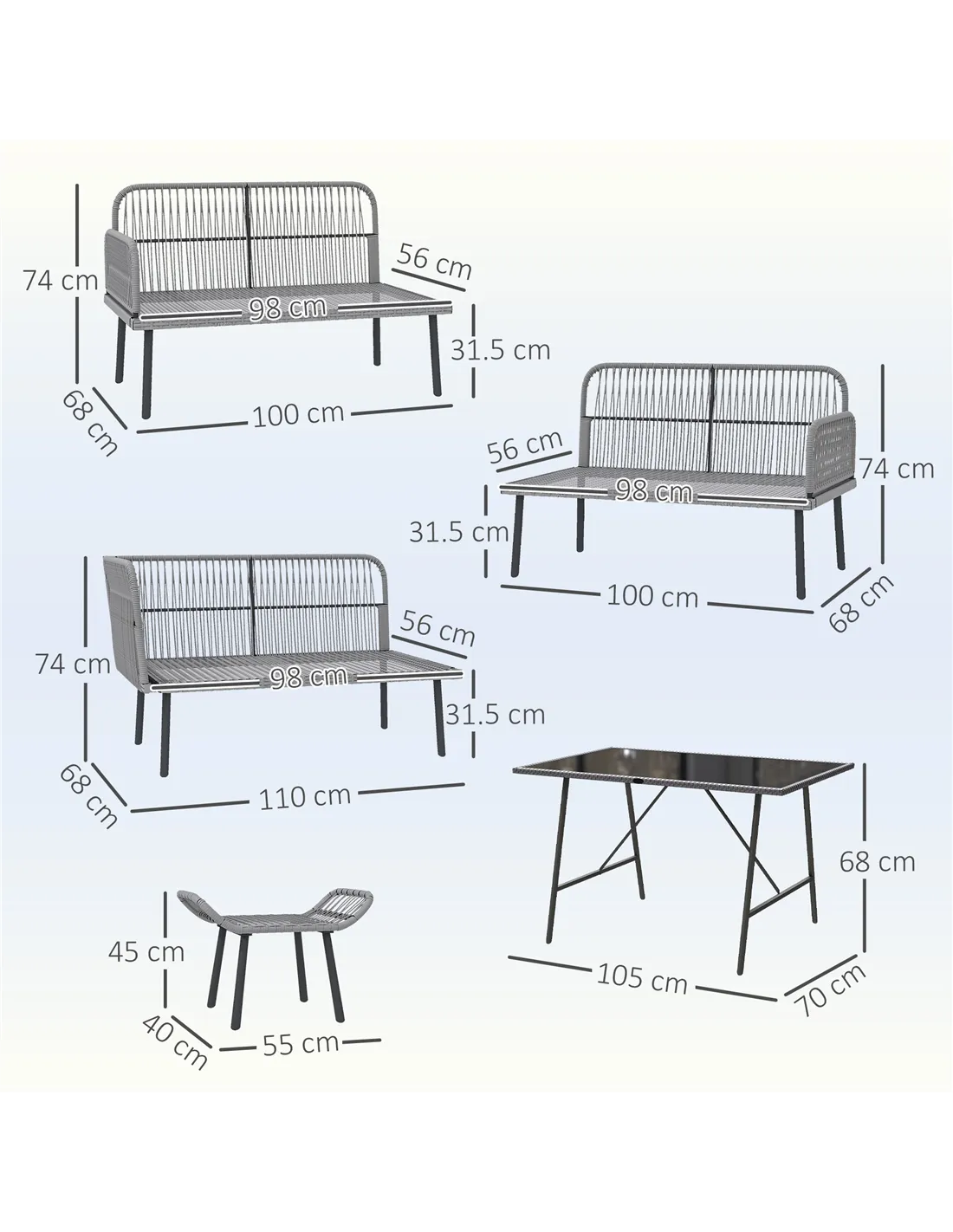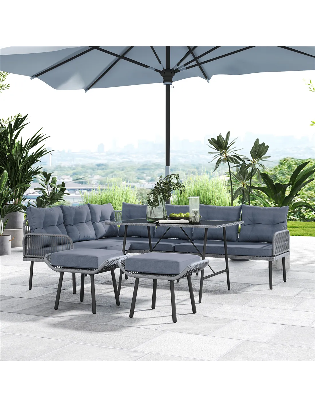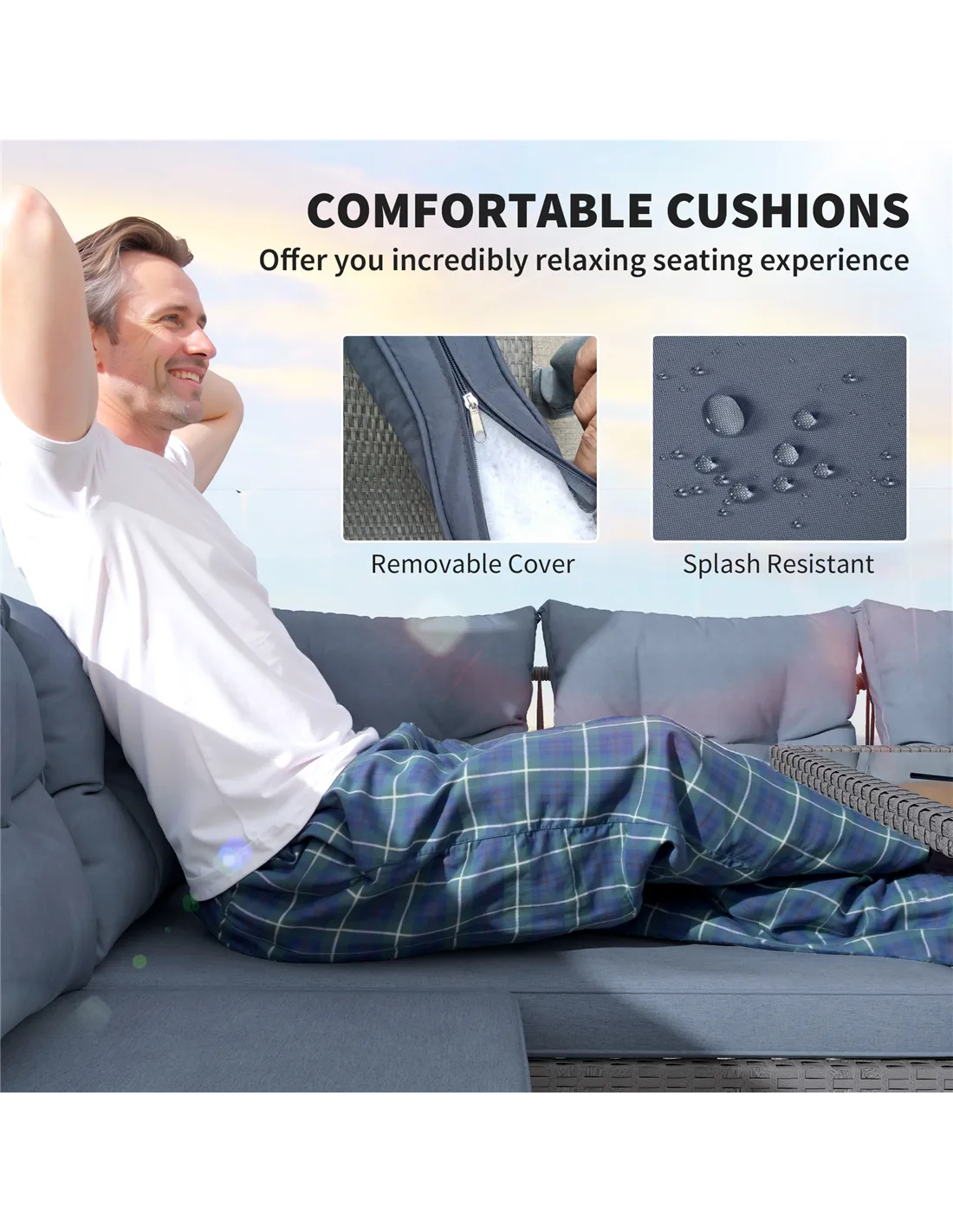 Transform your garden into a relaxing haven with the Outsunny 6-piece garden sofa set. This versatile outdoor garden furniture includes two left/right-hand sofas, a cosy corner sofa, a table and two stools, all designed for customizable configurations. Crafted with robust steel and wrapped in all-weather wicker PE rattan, paired with plush cushions, it's a great choice for outdoor lounging.