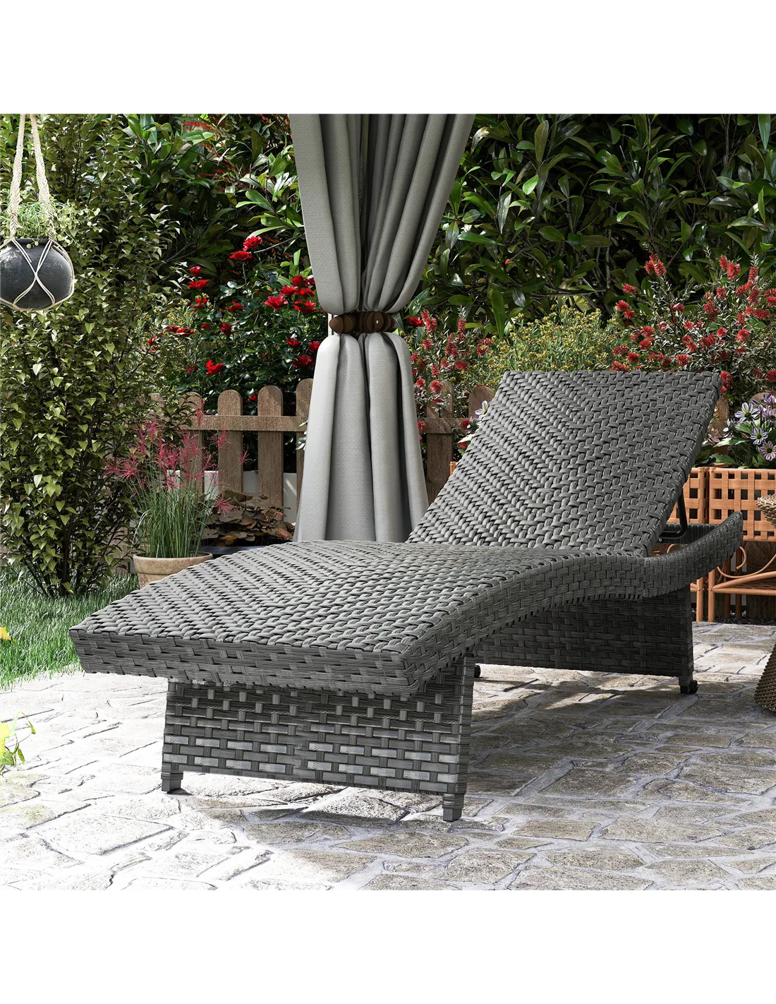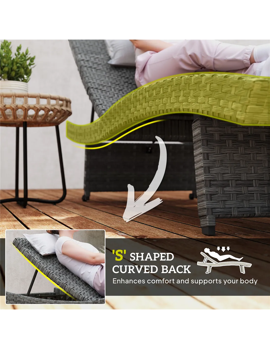 Relax in style with the Outsunny Rattan Sun Lounger! The ergonomic 'S' shaped curve offers comfort, while the adjustable backrest provides four reclining positions. With smooth wheels for easy mobility and a foldable design for storage, this outdoor lounge chair made of PE rattan and steel ensures a cool, relaxing experience for years. Great for your outdoor oasis!
