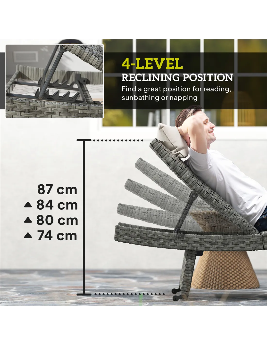 Based on reviews from UK customers, the Outsunny sun lounger is praised for its sturdy construction and comfortable ergonomic design. Many highlight the ease of adjusting the backrest to four different positions, which allows personalised comfort whether lounging upright or lying flat. Users appreciate the smooth wheels that make relocating the chair hassle-free, especially on patios and garden paths. The mixed-grey PE rattan finish is noted for its modern aesthetic that complements various outdoor decors. Overall, buyers commend the durability and weather-resistant materials, confirming Outsunny’s reputation as a trusted brand in garden and outdoor furniture across the UK.