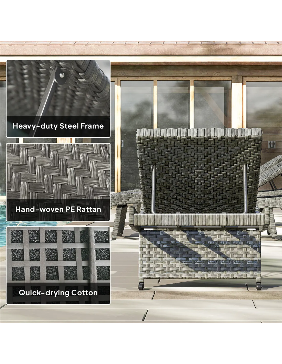 - Materials: Steel, PE Rattan, Quick Dry Cotton (100% Polyester)