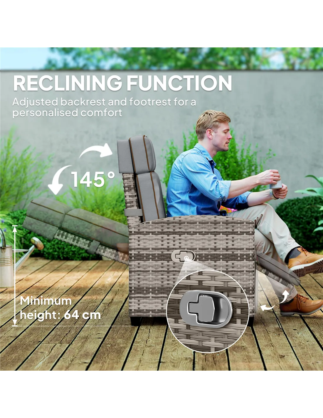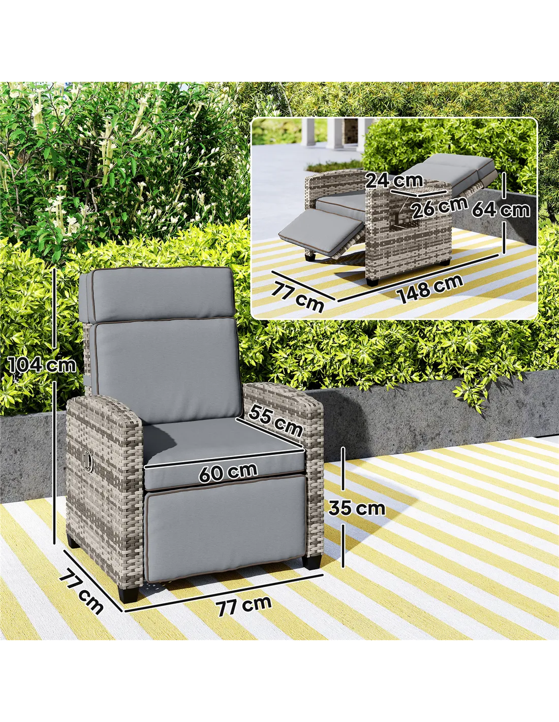Forever on-trend rattan style, at an angle you want to relax - thanks to this Outsunny rattan recliner chair. The back reclines to a maximum 145° - paired with the manual footrest for full body relaxation. The wide seat is fitted with a padded seat cushion for plenty of comfort. It's complete with a flip-up side tray to keep items right next to you.