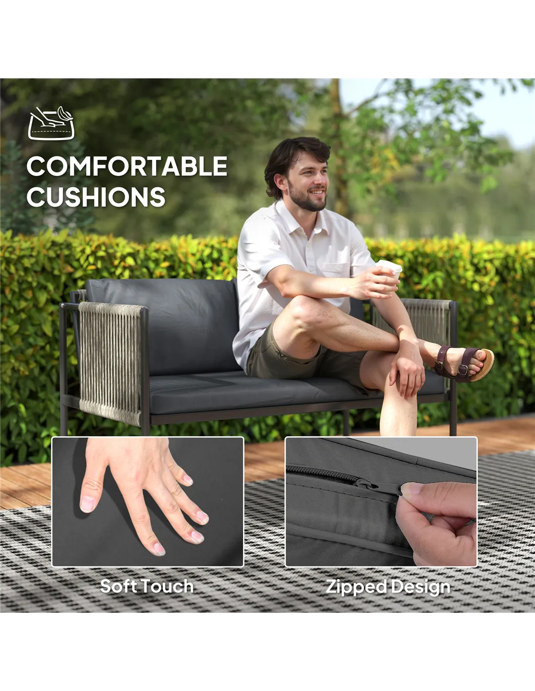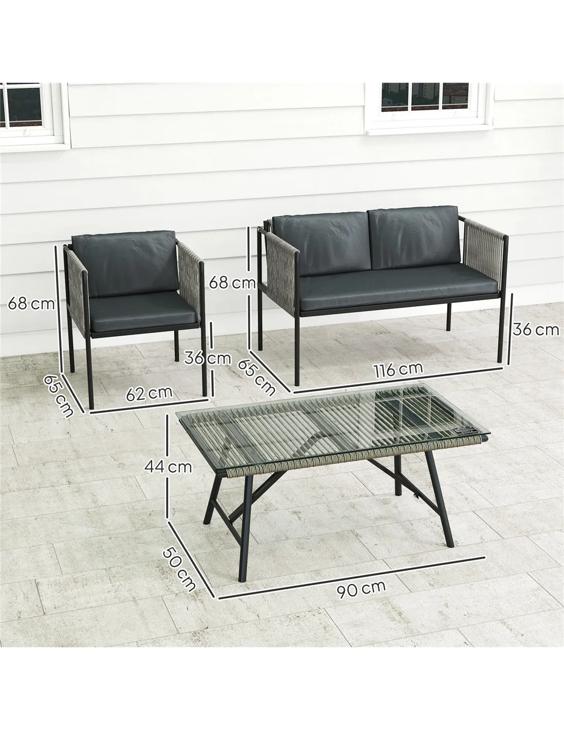 The Outsunny four-piece rattan rope sofa set in grey is perfect for creating a stylish and inviting outdoor lounge area. Ideal for British gardens, patios, or conservatories, this set comfortably accommodates up to four people, making it excellent for casual gatherings or relaxing afternoons. Pair the loveseat and armchairs with the tempered glass coffee table to enjoy morning coffee, afternoon tea, or evening drinks in comfort. Thanks to its splash-resistant cushions and UV-resistant rattan, it withstands typical UK weather, ensuring long-lasting appeal. Whether hosting friends or enjoying quiet family time, this set adds a contemporary touch to any outdoor space.