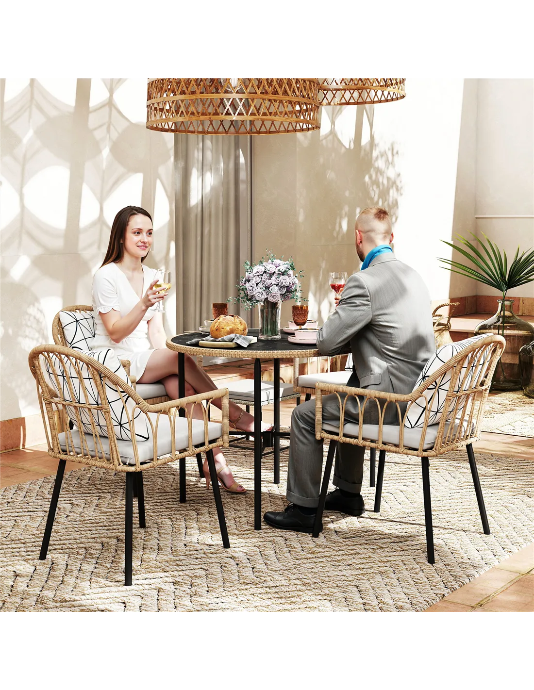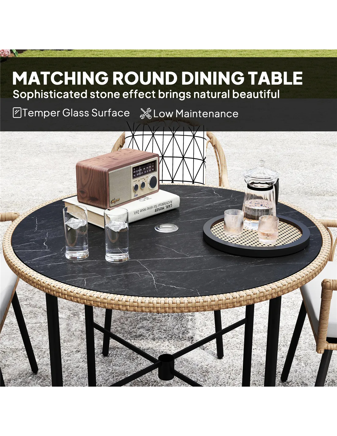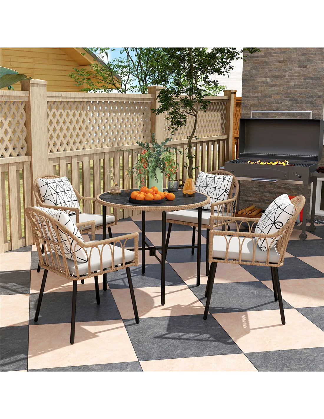 This 5-piece patio table and chairs feature a classic rattan design, complete with a soft cushion and throw pillow for enhanced comfort. The table boasts a tempered glass top with a stone effect, offering both beauty and durability. Suitable for any outdoor dining area, this set promises style and comfort in your outdoor living space.