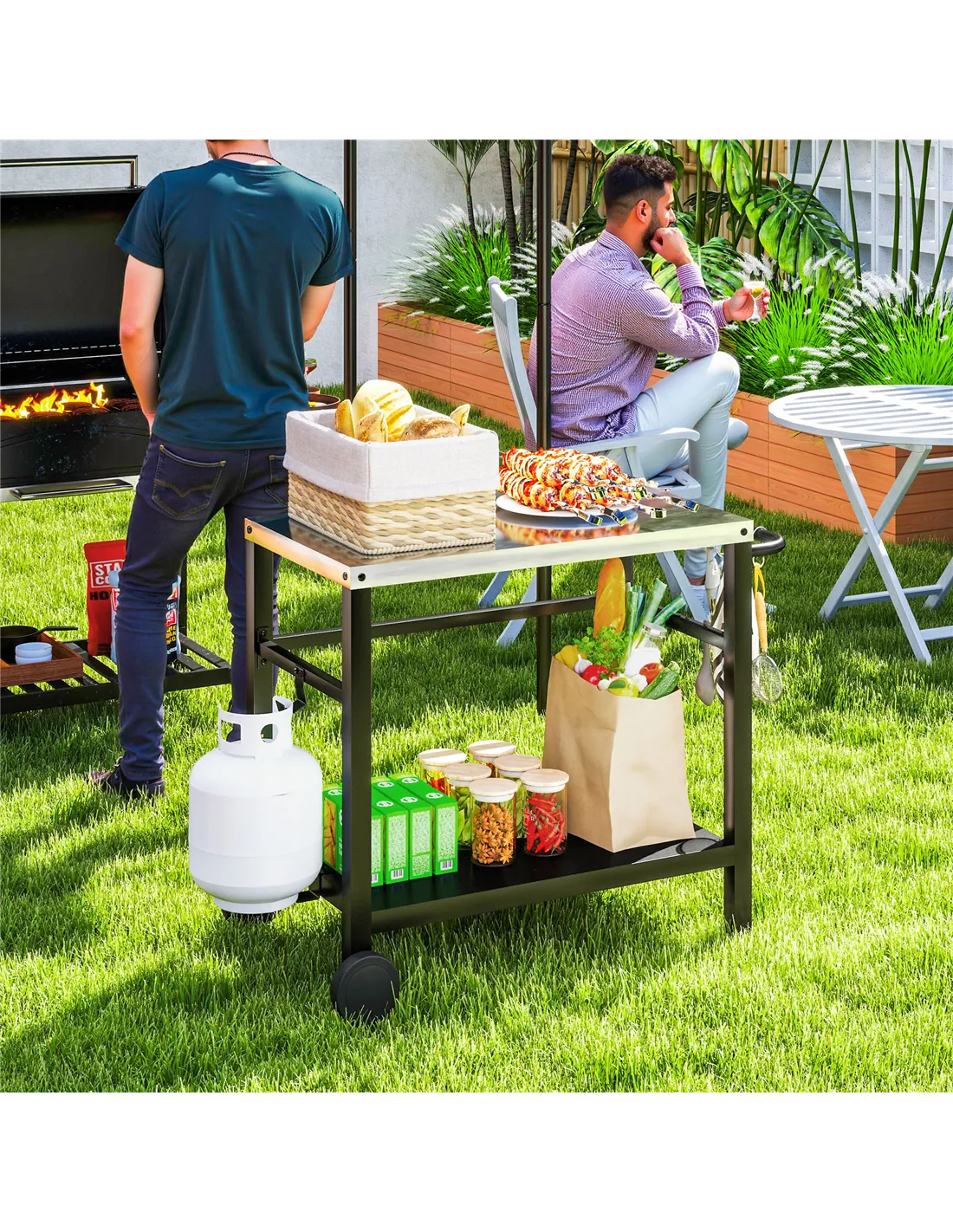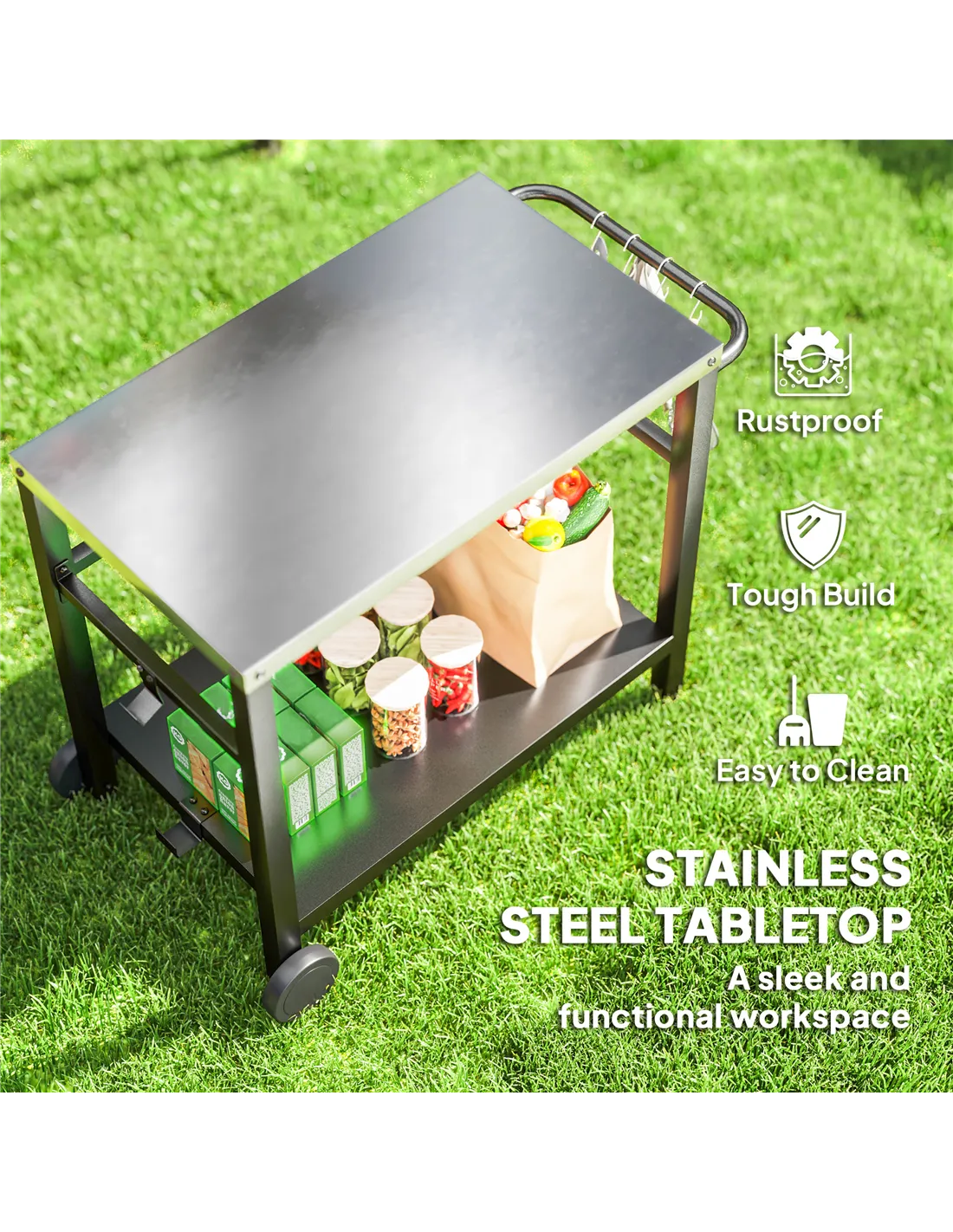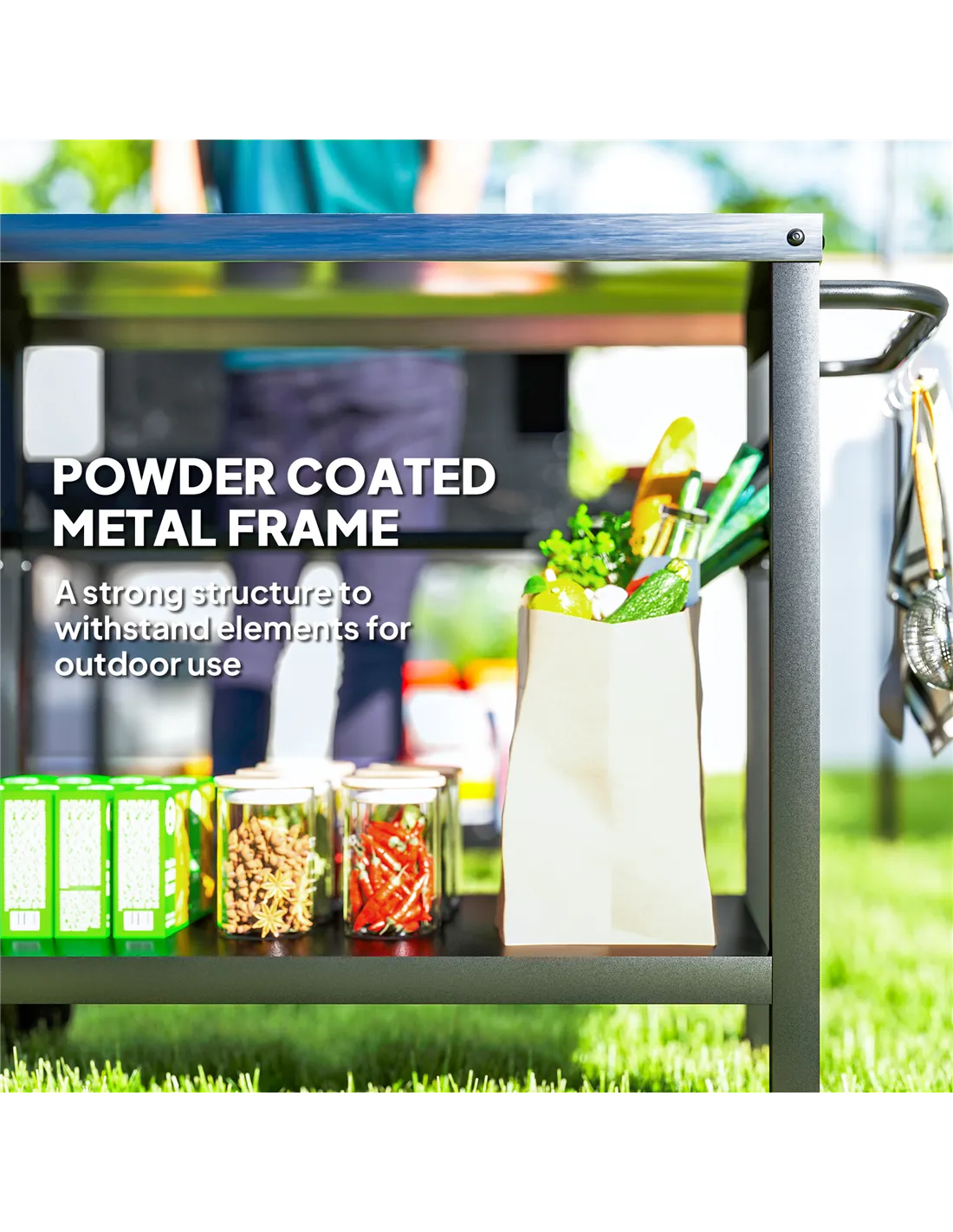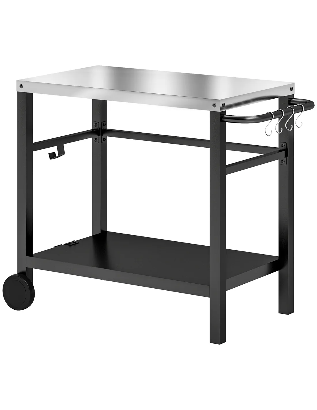 Plan to host some friends? Take entertaining to the next level with this Outsunny outdoor BBQ trolley. Featuring a stainless steel tabletop, a shelf, a handle that doubles as a towel rack, and many functional hooks, this BBQ table can hold all your meals, drinks and seasonings. Easily portable with the large wheels and side handle, the pizza table is excellent for meal prep and serving at picnics, BBQs, or family get-togethers. Get on a roll with Outsunny.