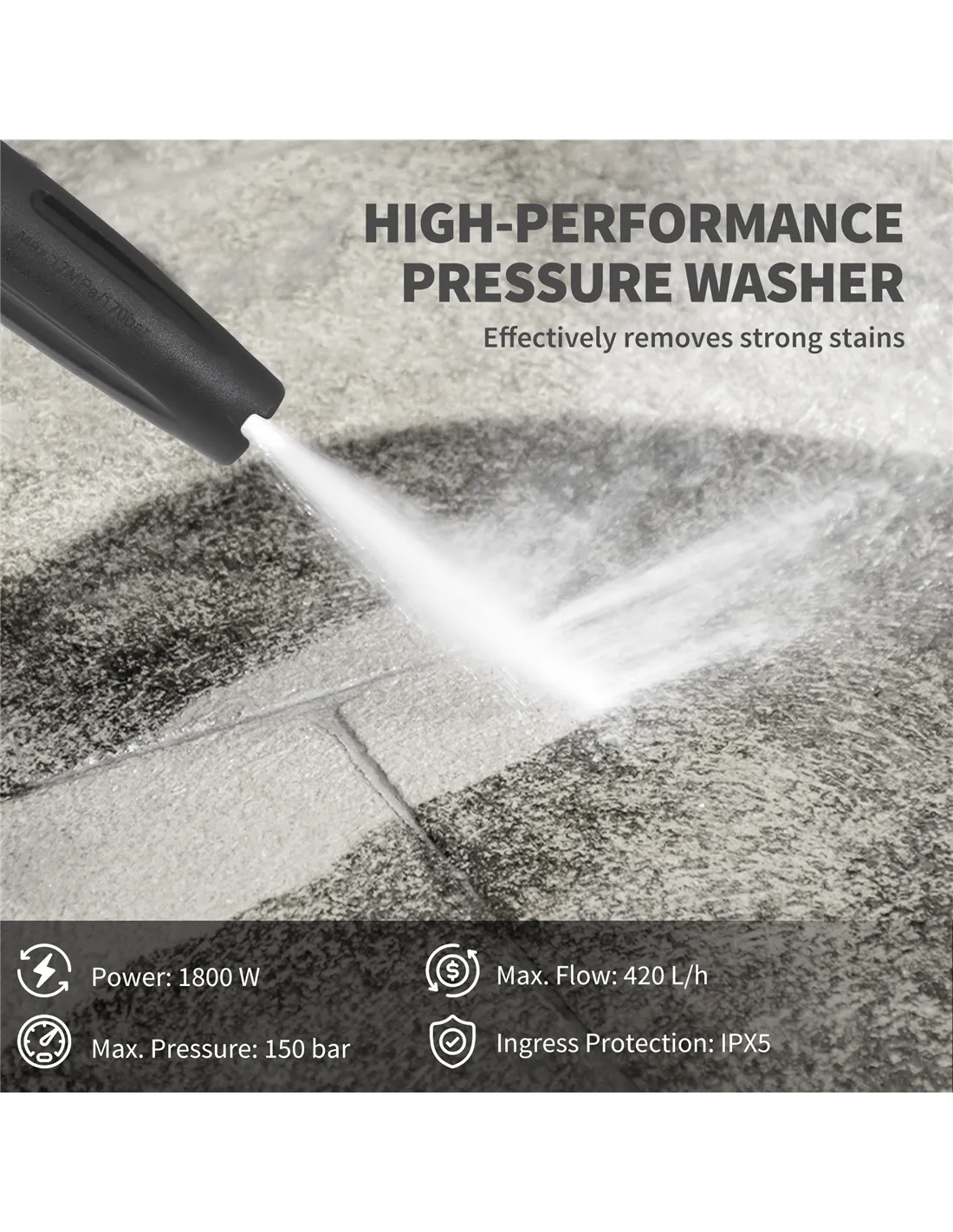 - 1800 W motor, with maximum 150 bar pressure. Provides 420 L water hourly
