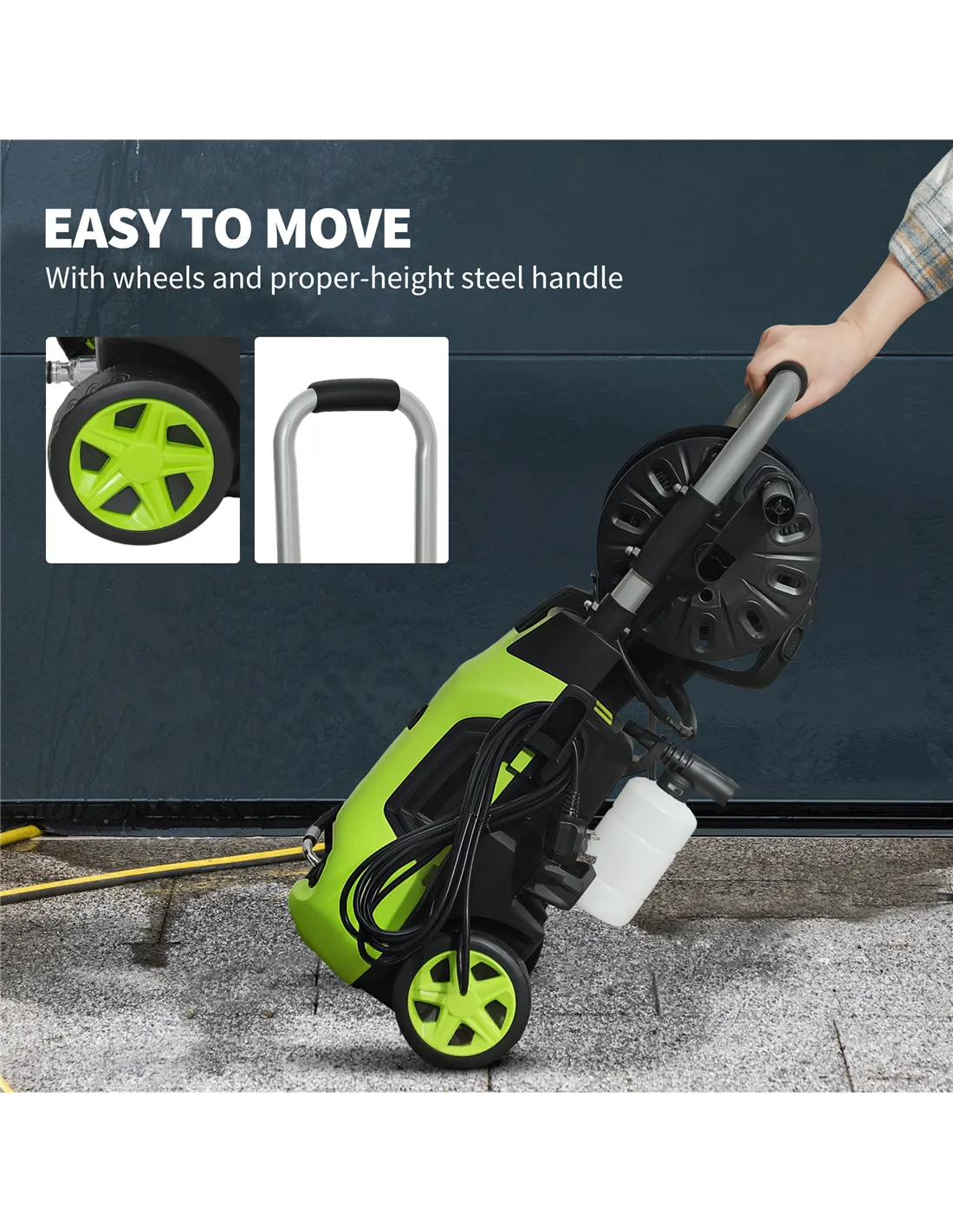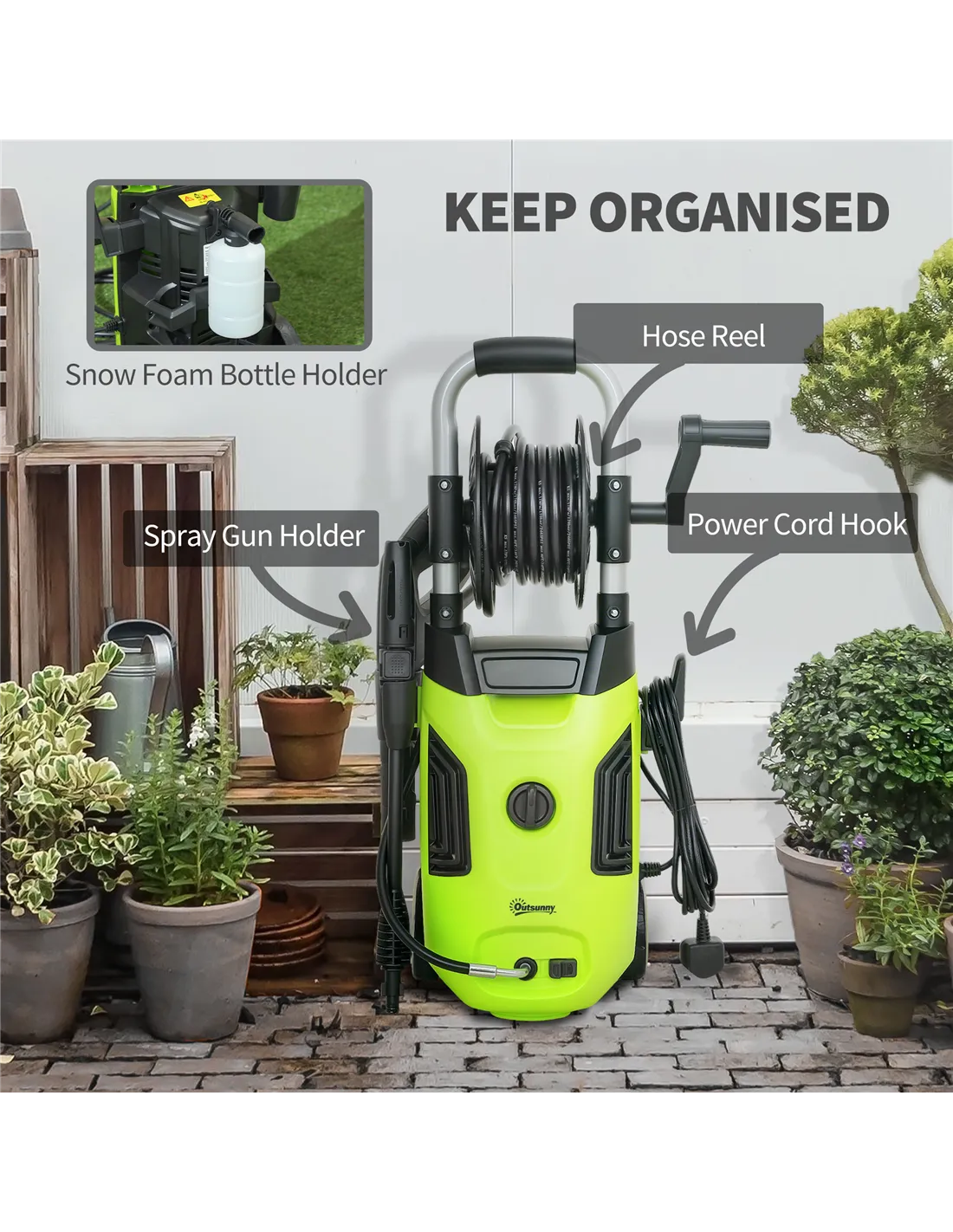 Outsunny 1800W High Pressure Washer, 150 Bar Pressure, 420 L/h Flow, Portable Power Washer Jet Wash Cleaner with Adjustable Nozzle, 6M Hose, Hose Reel, Steel Handle for Home Patio Car Driveway, Green