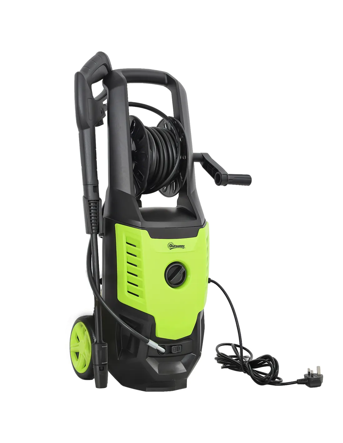Easy home cleaning of stubborn tasks - this Outsunny portable pressure washer. 2200 W motor, with a 170 bar pressure is powerful - provides 420 litres of water per hour. Deal with a variety of dirt and stains. You can adjust the nozzle angle between 0° and 75°, making it easy to direct the pressured water to a position you require. With the six-metre long hose, five-metre long power cord and wheels, you can move it around and reach long distances easily.