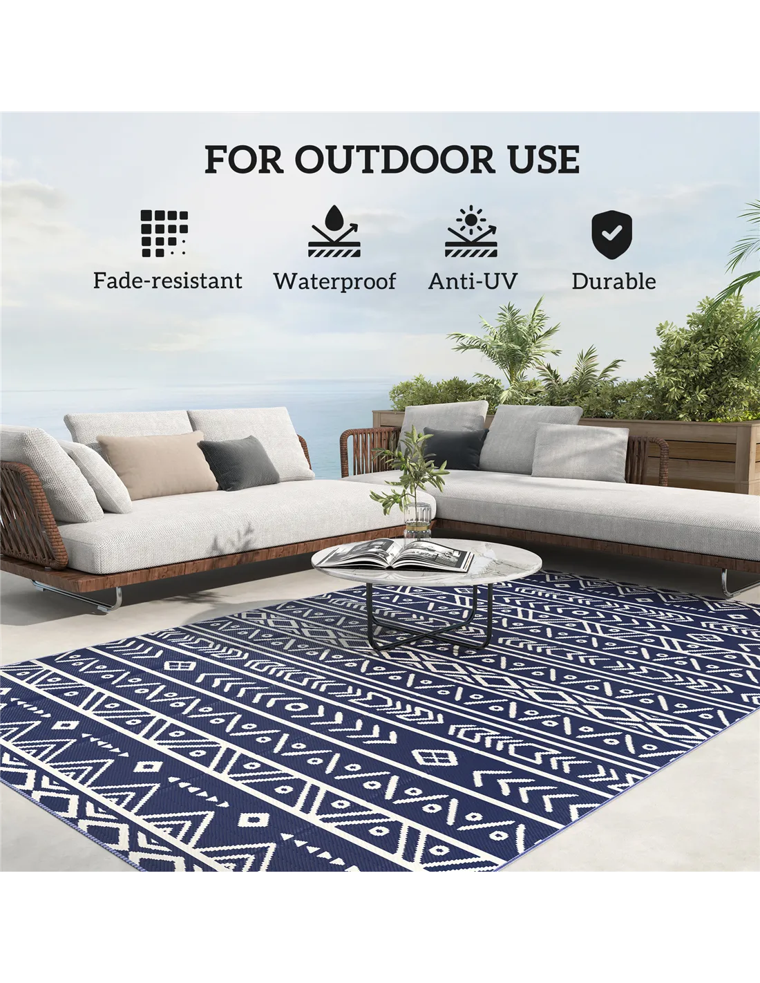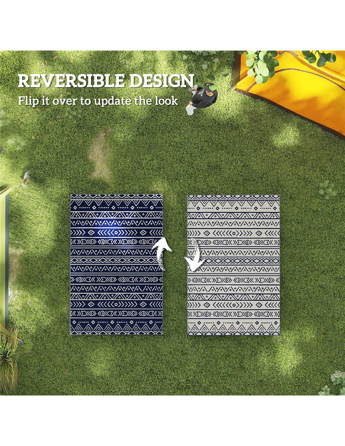 The Outsunny reversible outdoor rug is a versatile addition to any outdoor setting. Ideal for gardens, patios, and decks, it provides a stylish and practical surface that resists dirt and moisture. Its waterproof polypropylene material makes it perfect for beach days, camping trips, or picnics, offering a comfortable and easy-to-clean base. The rug’s reversible design allows you to switch between dark blue and white geometric patterns, refreshing your outdoor décor effortlessly. Compact and foldable, it fits neatly into the included carry bag, making it a convenient companion for RV adventures and road trips across the UK.