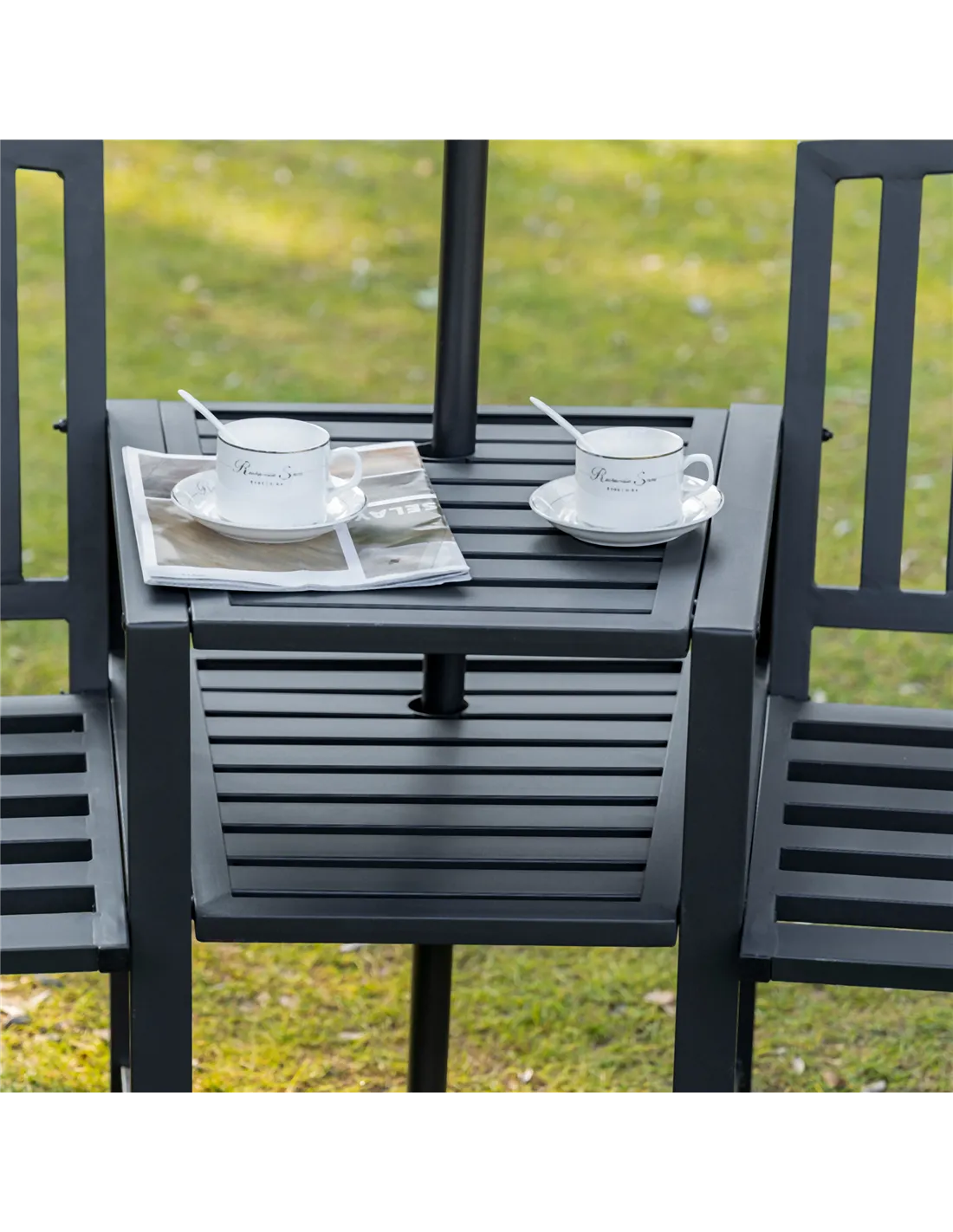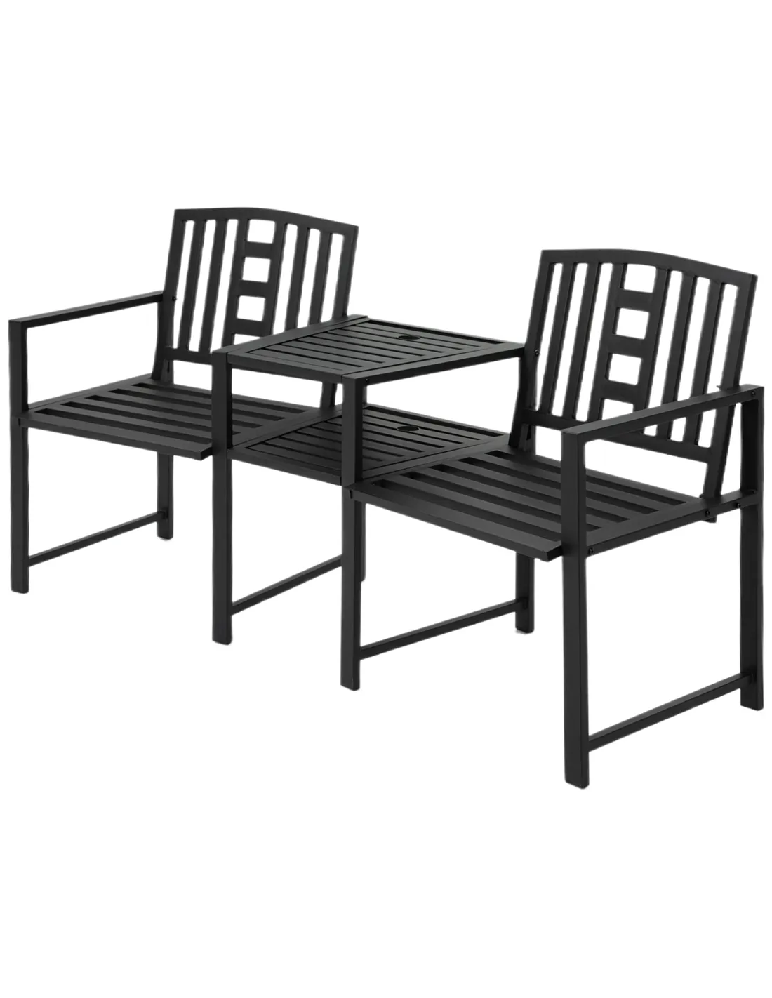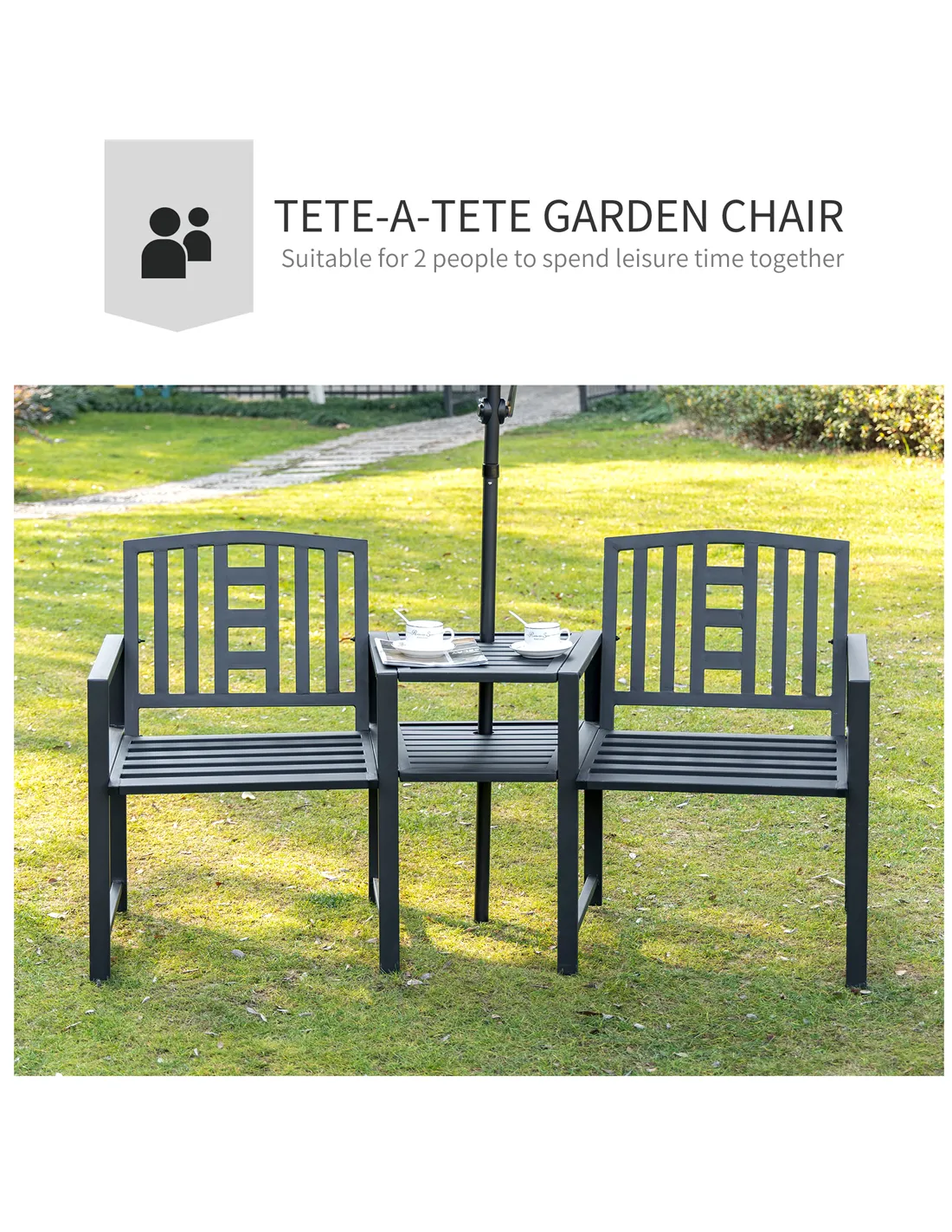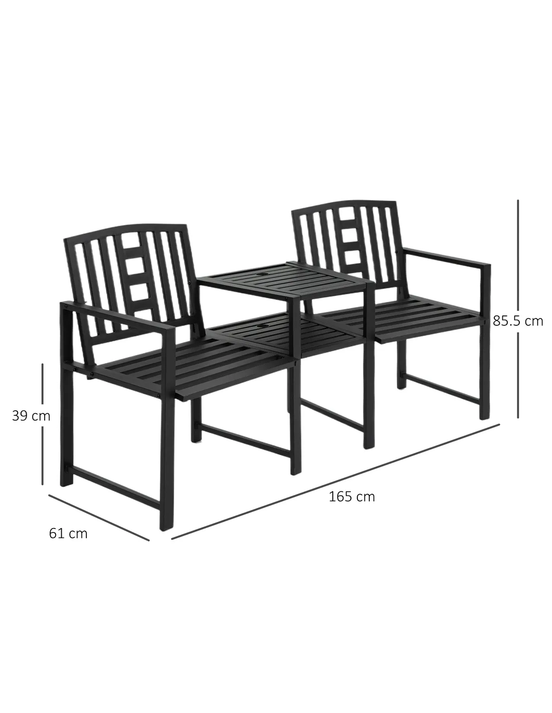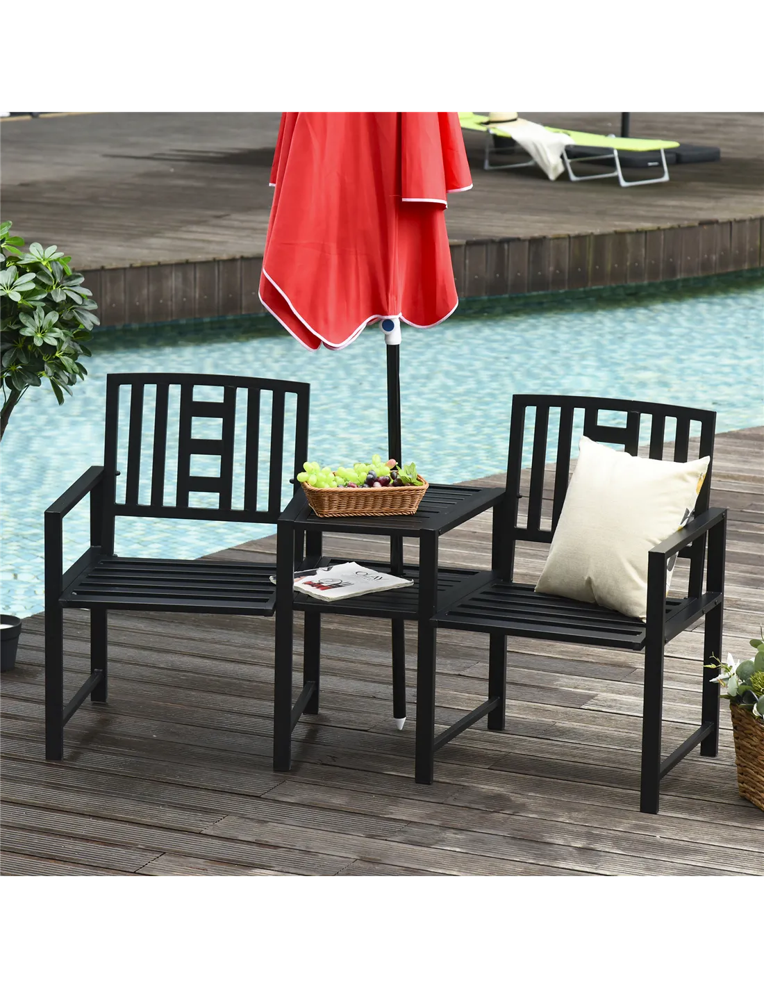 The Outsunny 2 Seat Garden Chair Bench with Coffee Table is an ideal addition to any British garden, patio, or yard, offering a stylish and practical seating solution. Perfect for enjoying morning coffee or afternoon tea outdoors, this compact loveseat allows two people to relax comfortably while sharing a conversation. The integrated coffee table with a parasol hole provides a convenient spot for drinks, snacks, or a book, making it suitable for casual gatherings or quiet moments in the fresh air. Its durable metal frame and slatted design ensure longevity and easy maintenance, even in the variable UK weather. Whether placed on a balcony, by the poolside, or in a cosy corner of your garden, this set enhances outdoor living spaces with both function and charm.