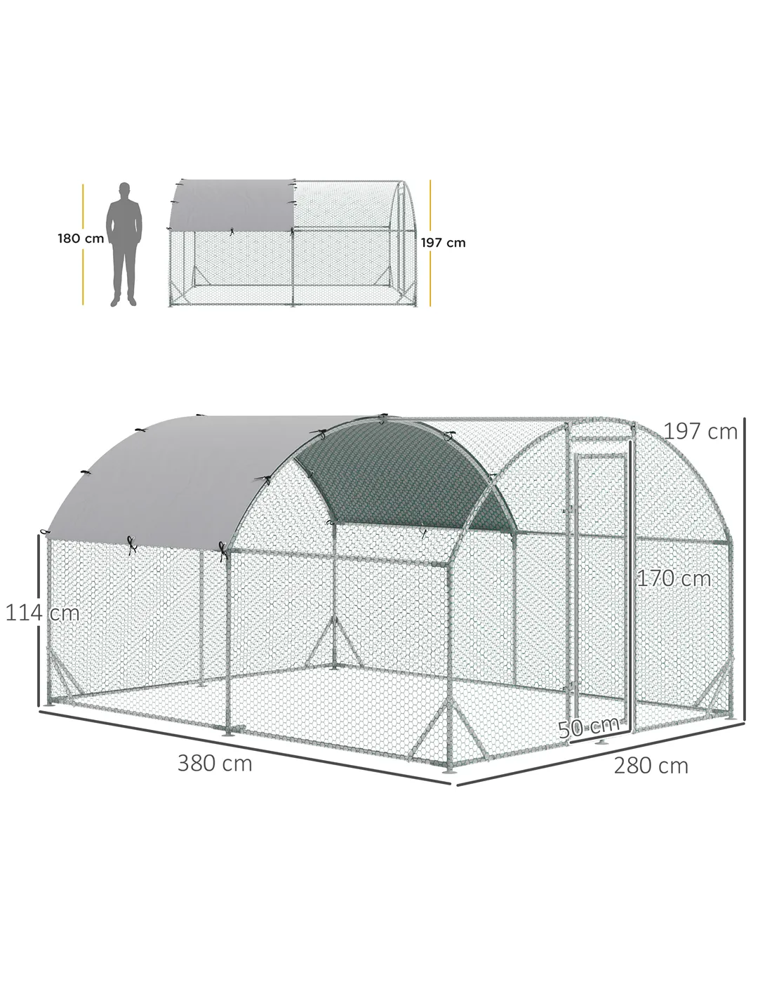 - Dimensions: 197H x 280L x 380Wcm. Eaves Height: 114cm. PE cover: 334L x 190Wcm. Door: 170H x 50Wcm
