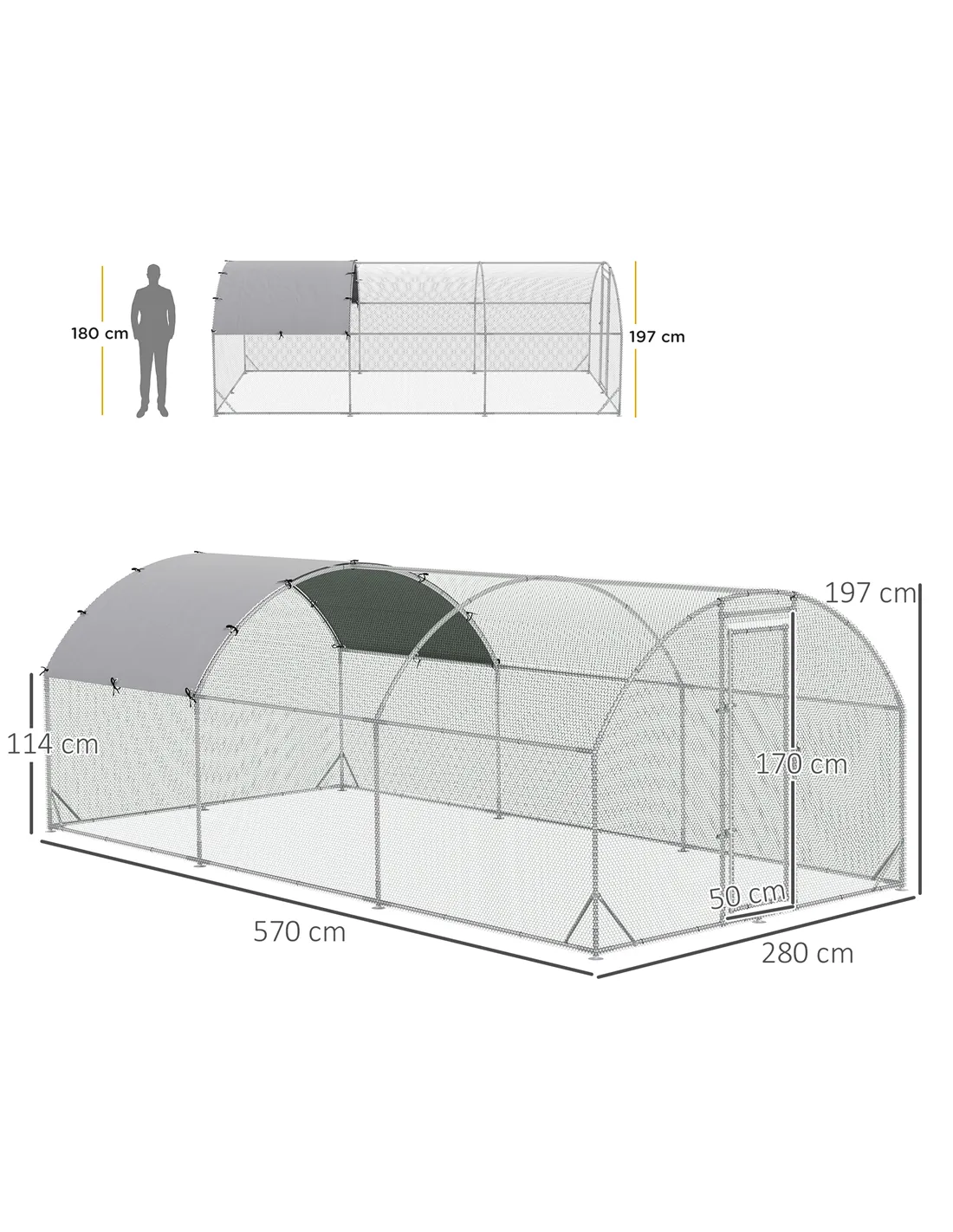- Dimensions: 197H x 570L x 280Wcm. Eaves Height: 114Hcm. Cover: 334L x 190Wcm. Door: 170H x 50Wcm