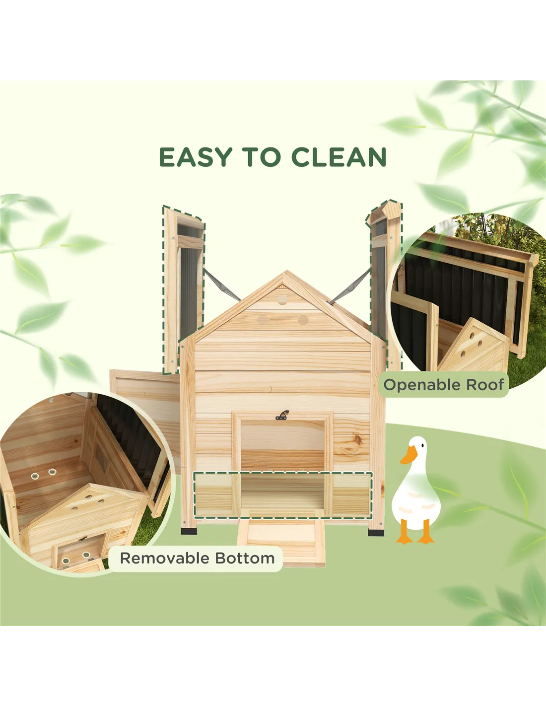Turn your garden into a cosy retreat for ducks with the PawHut small animal house. Its accessible roof and removable floor make cleaning a breeze. A front door offers easy pet access, while three top holes ensure proper ventilation, keeping your ducks cool and comfortable. Large side doors make egg collection and pet care simple. Set it up outdoors with ease – the slanted roof provides shelter all year round.