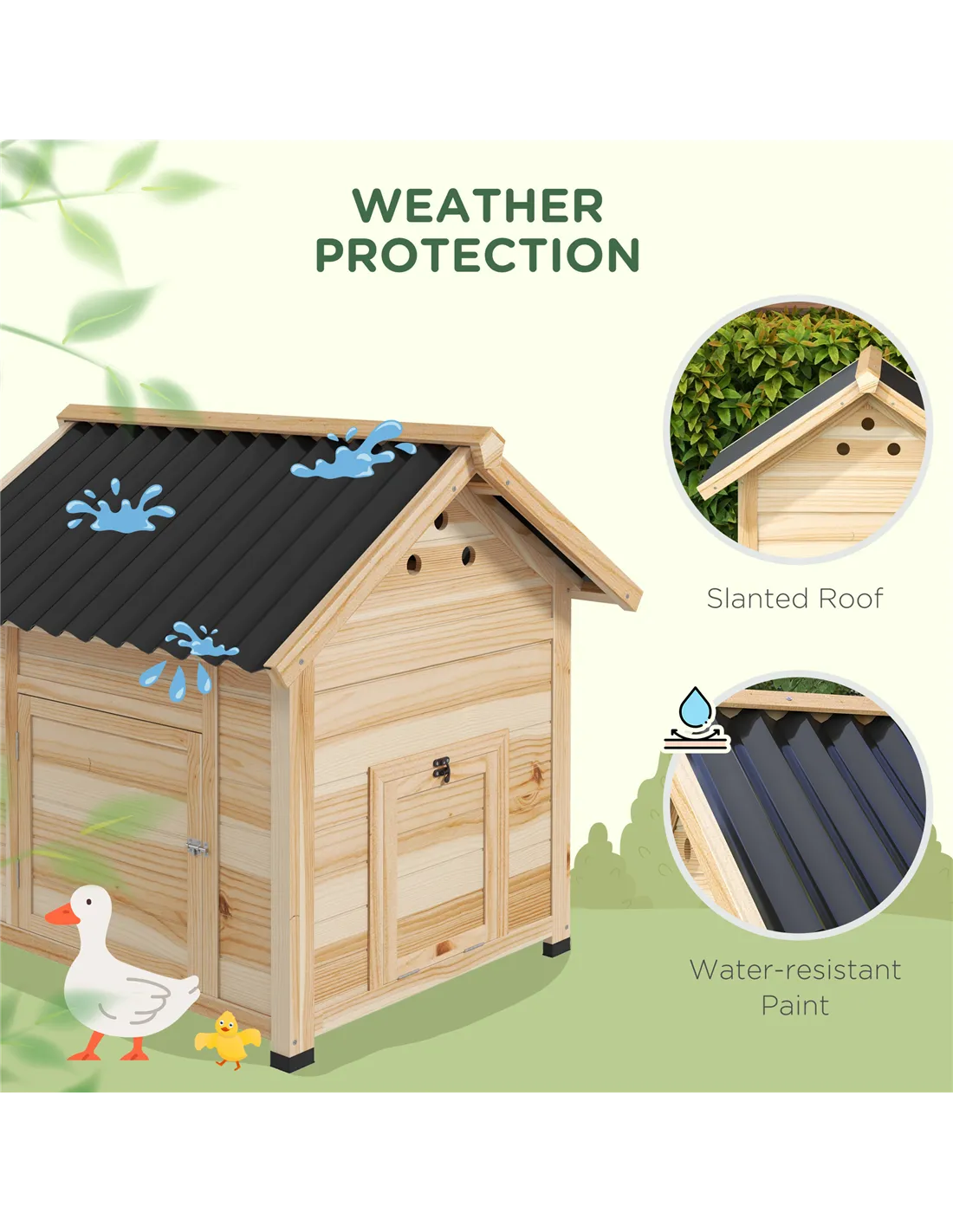 The PawHut wooden duck house is an ideal outdoor shelter for small waterfowl, providing a secure and comfortable environment in your garden or backyard. Thanks to its double doors and openable roof, it offers easy access for feeding, cleaning, and egg collection. The natural wood finish blends seamlessly with garden surroundings, making it a charming addition to any outdoor space. Suitable for up to three ducks or other small animals, this house ensures proper ventilation through strategically placed holes, keeping your pets cool during warmer months. Its slanted roof design effectively channels rainwater away, offering year-round protection from the elements. Whether you are a hobby farmer or a nature enthusiast, this duck house supports healthy and happy animals with minimal maintenance.