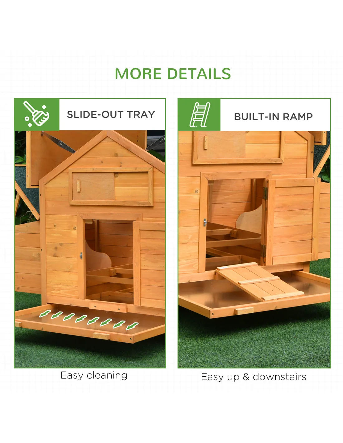 House your chickens in this spacious PawHut chicken coop, which features two nesting boxes for easy egg laying and collection. A slide-out tray and openable tops make cleaning simple, while the water-resistant paint finish protects the coop in various weather conditions. The slanted asphalt roof offers shade and shelter year-round, making it suitable for outdoor use. This comfortable haven is great for 2-4 pets, depending on their size and breed.