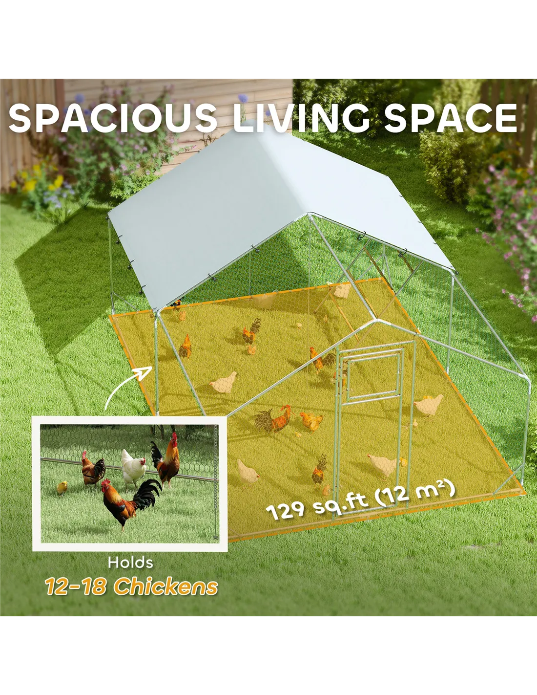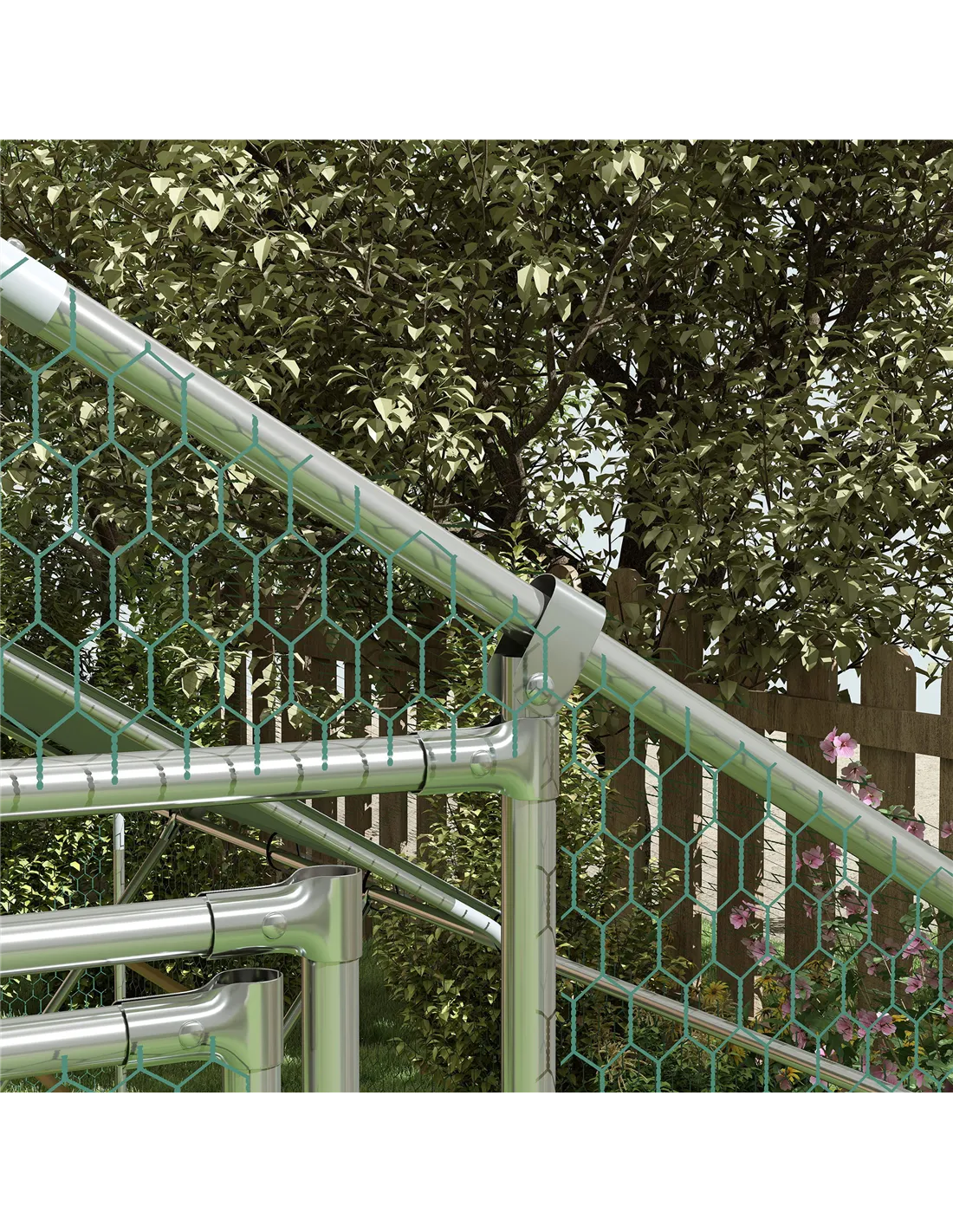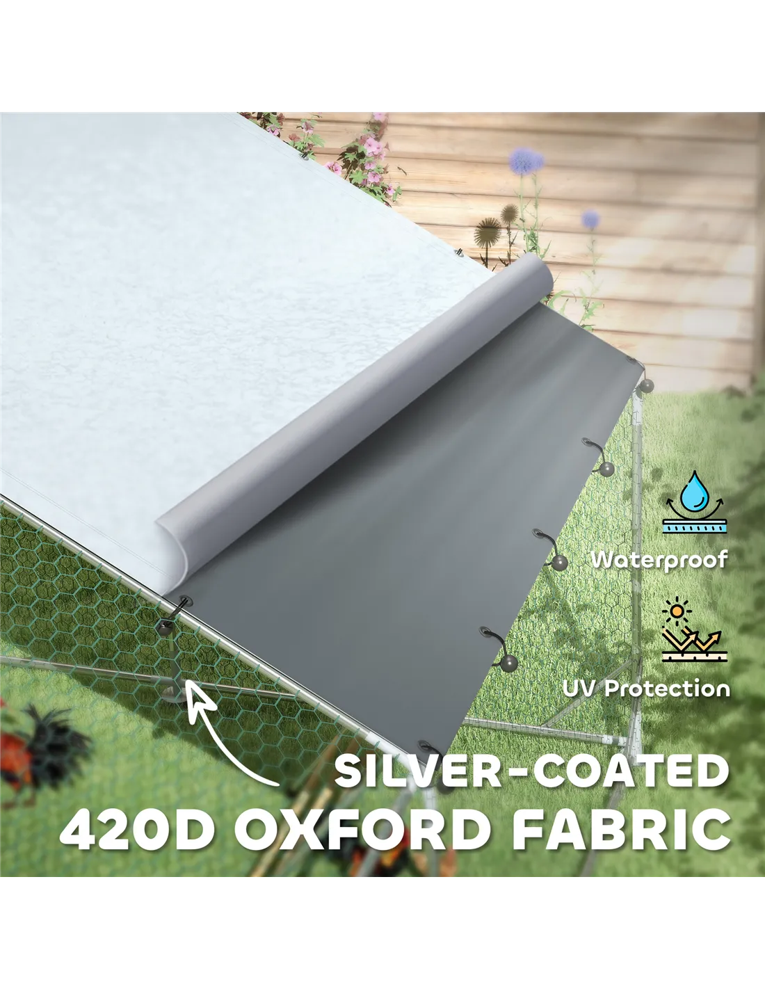 House up to 18 chickens with this large chicken run from PawHut. Offering 12m² of space, it provides plenty of room for them to roam. Made with galvanised steel and UV-resistant oxford fabric, it ensures a safe and comfortable shelter. The door features a built-in feeding door for easy access. Inside, you'll find a feeder and perches, so your chickens have everything they need to live comfortably.