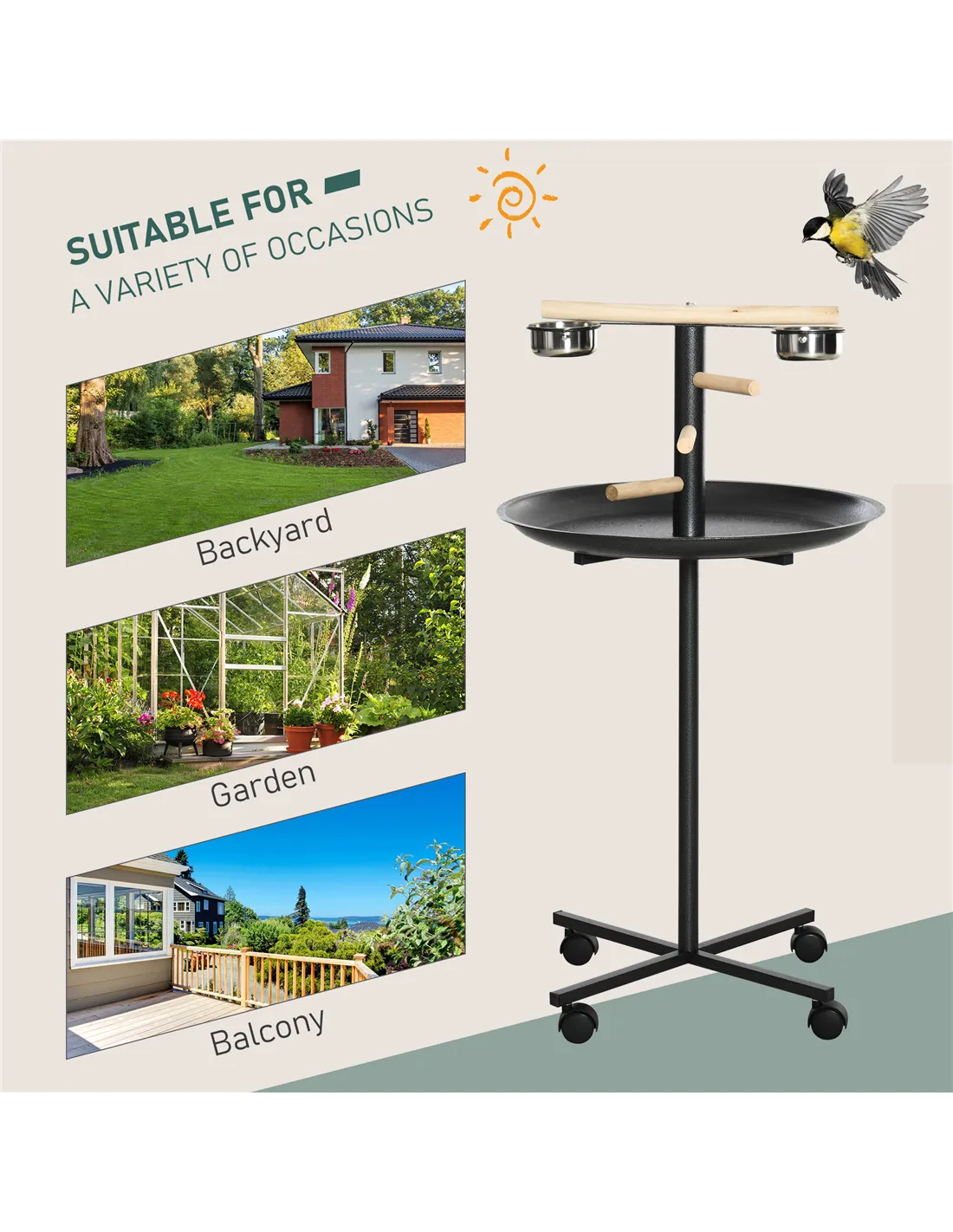 This PawHut bird feeding station provides a spot for birds to relax, whilst having easy access to food and water, thanks to the two stainless steel bowls. They'll be standing on strong wooden perches, whilst the tray underneath, which is easy to clean, catches bits of food and bird droppings, so it doesn't fall to the floor, keeping your space tidy. Four wheels at the bottom – you can move the stand anywhere with minimum fuss.
