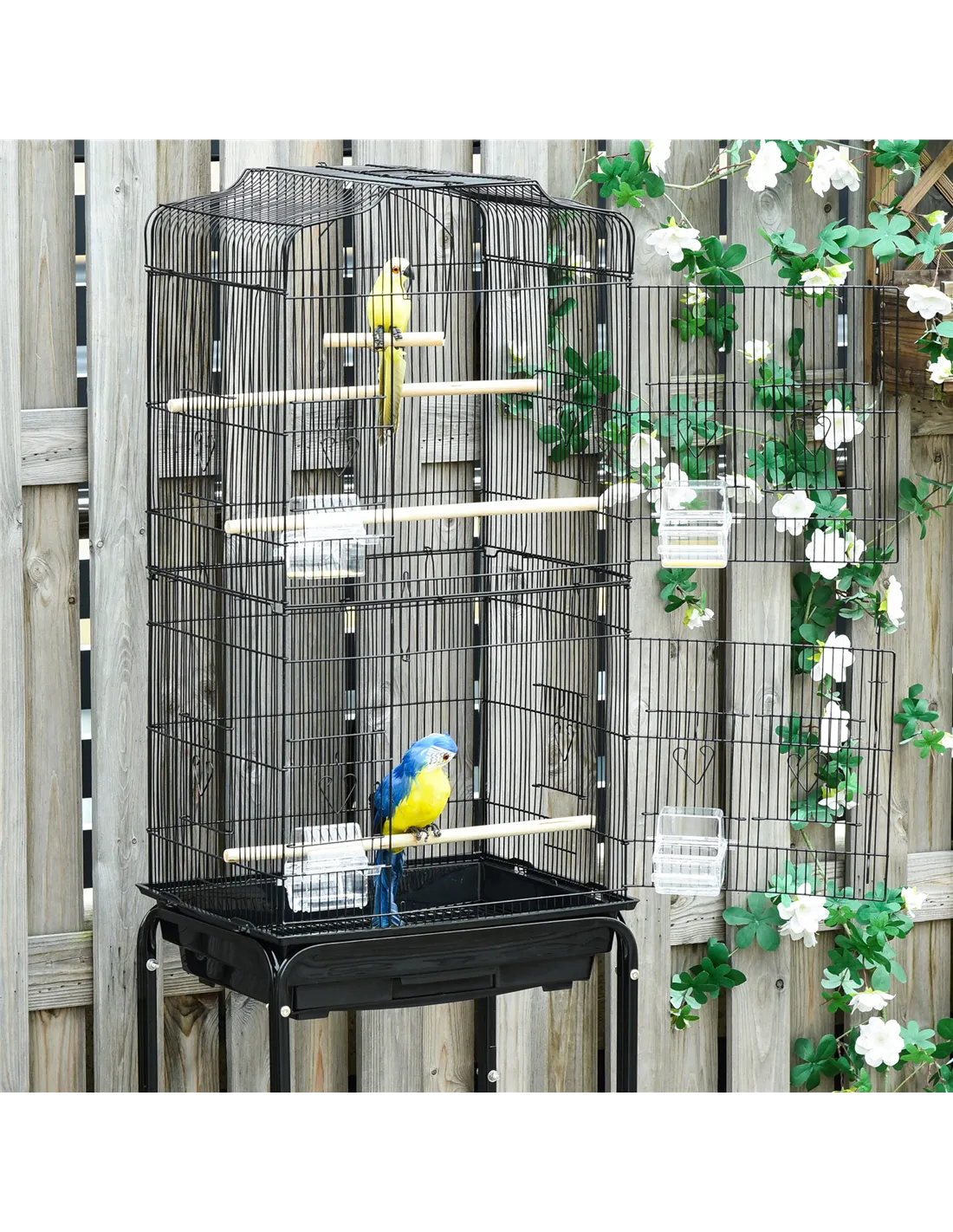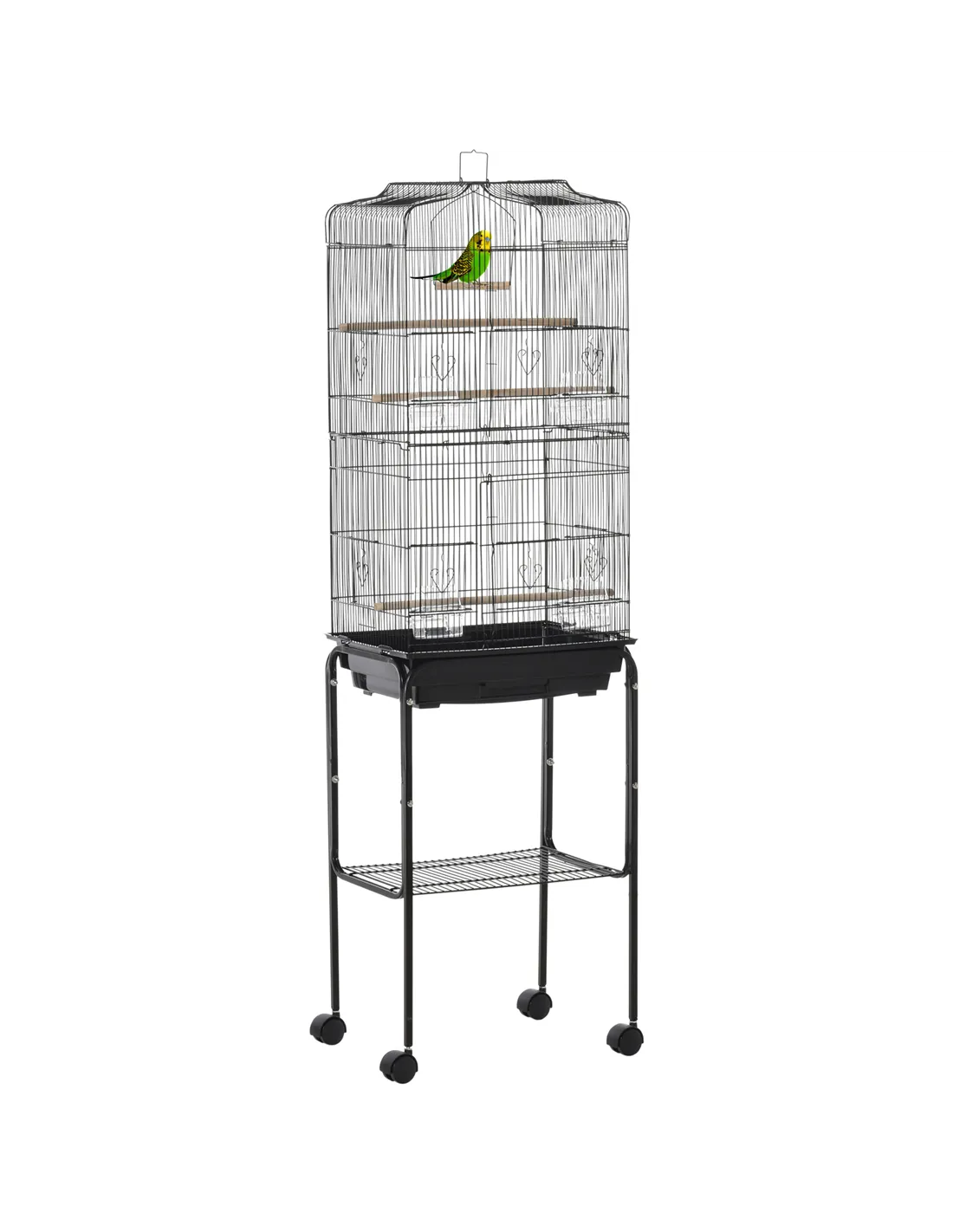 Give your bird this cage they'll love from PawHut. Made from powder-coated metal with four wheels for easy movement, it is crafted into a spacious design that gives your pet plenty of room to move about, along with three wooden perches, a wooden swing and four plastic food containers. Two oversized doors are fitted on the front with sliding food doors to provide you easy access inside the cage with minimal disruption and it is finished with a slide-out tray on the bottom for easy cleaning.