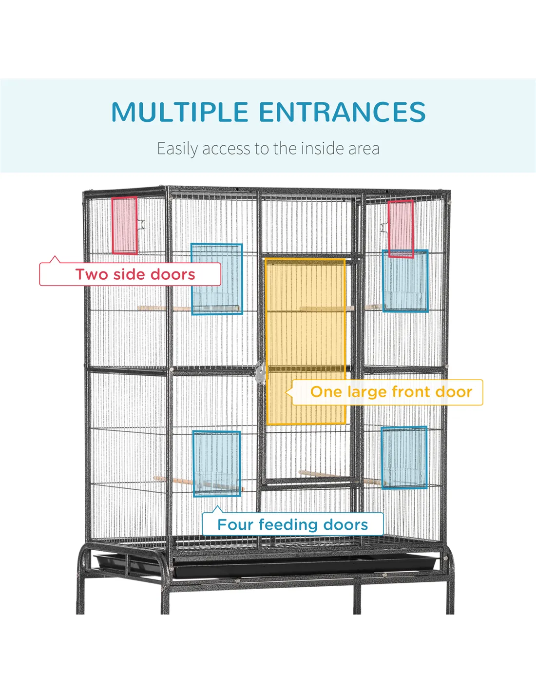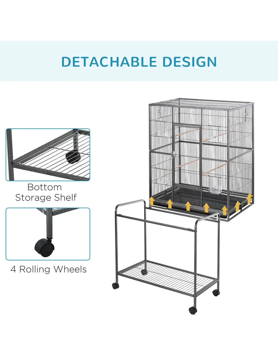 Need a secure home for pets? This PawHut canary cage is the solution. Enough space to spread their wings, they'll have a choice of perches to rest on. Plastic containers inside for access to food, Whilst the 7 doors make it simple to get in the cage, ensuring they have enough food and water. Pull-out tray at the bottom for quick cleaning, keeping their space tidy. A stand underneath with four wheels for easy movement. The cage is detachable from the stand, suitable for smaller spaces.