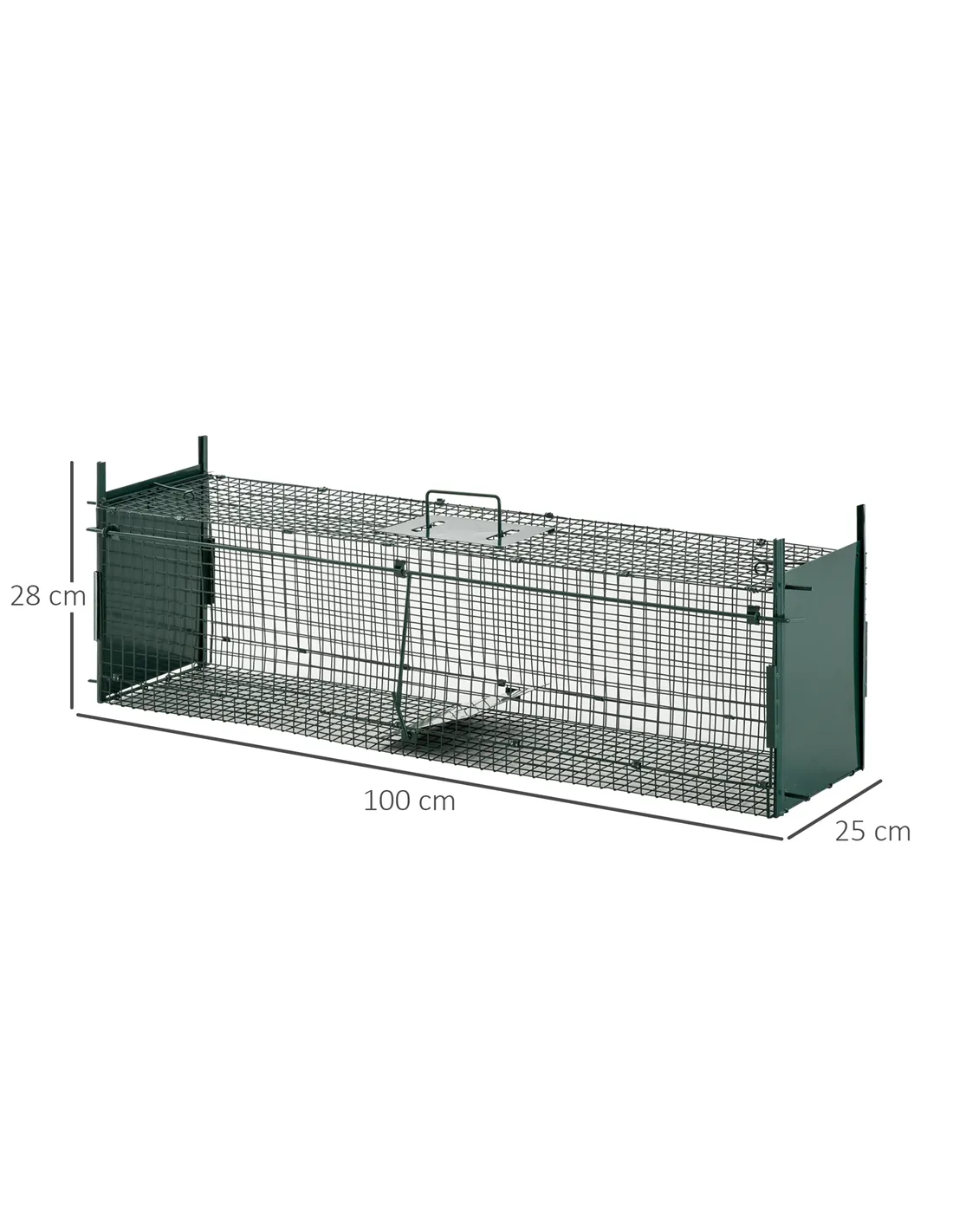 Introducing the PawHut animal trap – a two-door wonder designed for capturing multiple small animals. Its sensitive trigger ensures efficient pray capture. With a top handle for easy transportation, its discreet dark green colour helps confuse wildlife. A humane and efficient way of trapping pests, it's a versatile solution for a variety of needs.