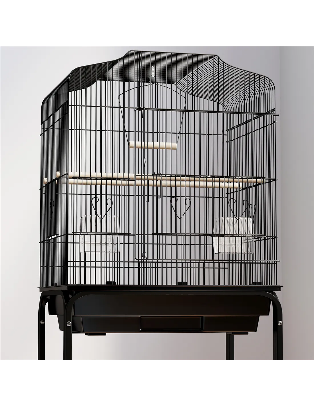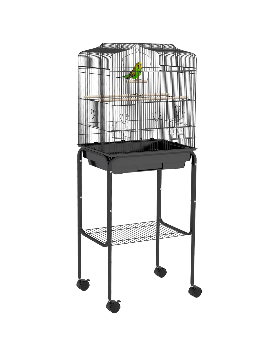 Give your bird this cage they'll love from PawHut. Made from powder-coated metal with four wheels for easy movement, it is crafted into a spacious design that gives your pet plenty of room to move about, along with two wooden perches, a wooden swing and two plastic food containers. An oversized door is fitted on the front with sliding food doors to provide you easy access inside the cage with minimal disruption and it is finished with a slide-out tray on the bottom for easy cleaning.