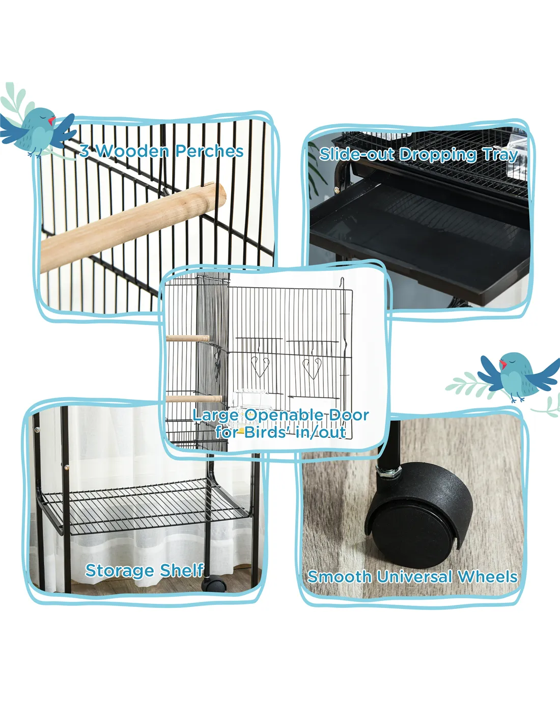 Based on customer reviews, the PawHut bird cage is praised for its robust construction and ease of cleaning, particularly the slide-out tray which simplifies maintenance. Users appreciate the large front door and sliding food doors, which allow hassle-free access without disturbing their feathered friends. Many highlight the convenience of the wheels for moving the cage effortlessly, especially in multi-room homes. The included accessories such as the wooden swing and perches receive positive remarks for enhancing bird comfort and activity. Overall, buyers commend PawHut as a trusted brand in pet supplies across the UK, noting the cage’s excellent value and thoughtful design.