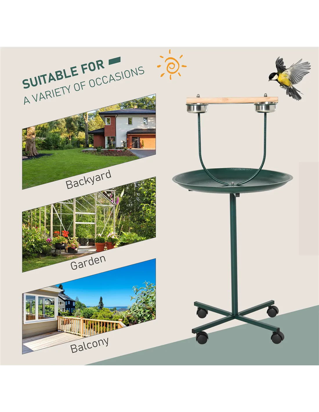 - Wheels let you move the bird stand around, with brakes to keep it in place when needed