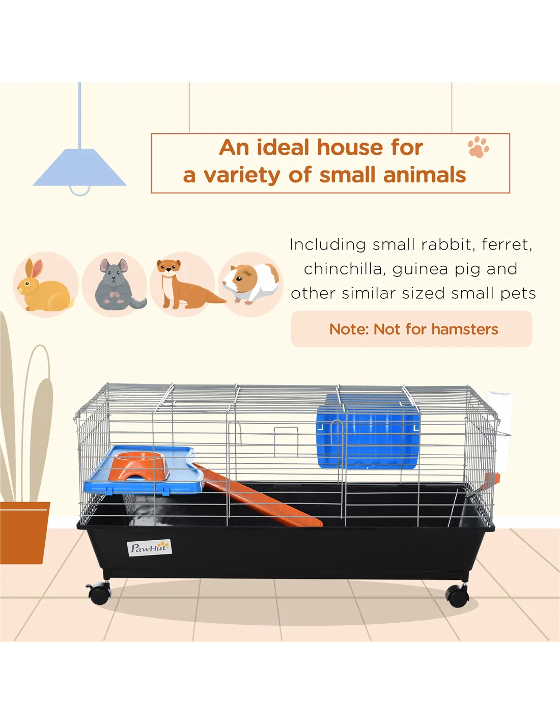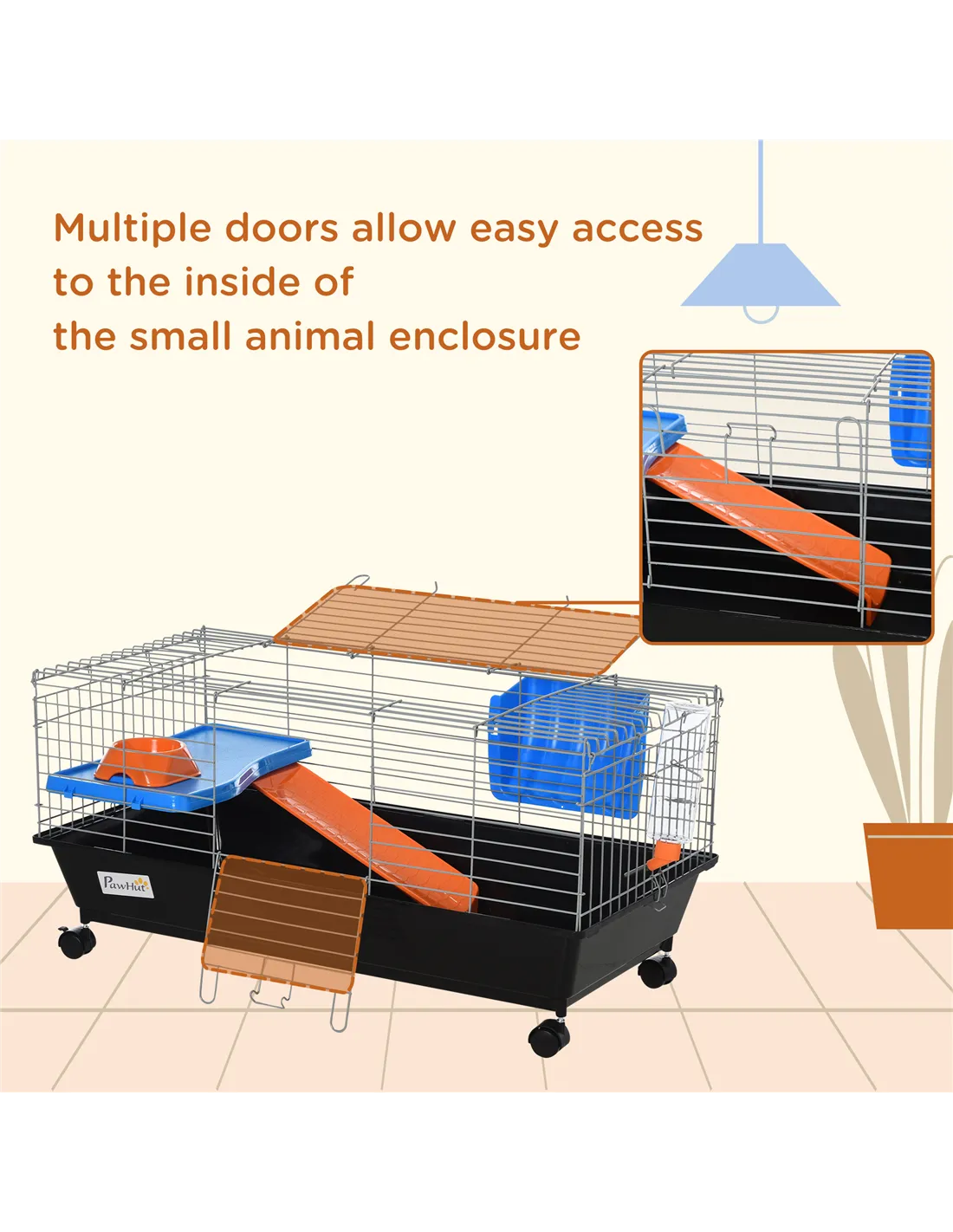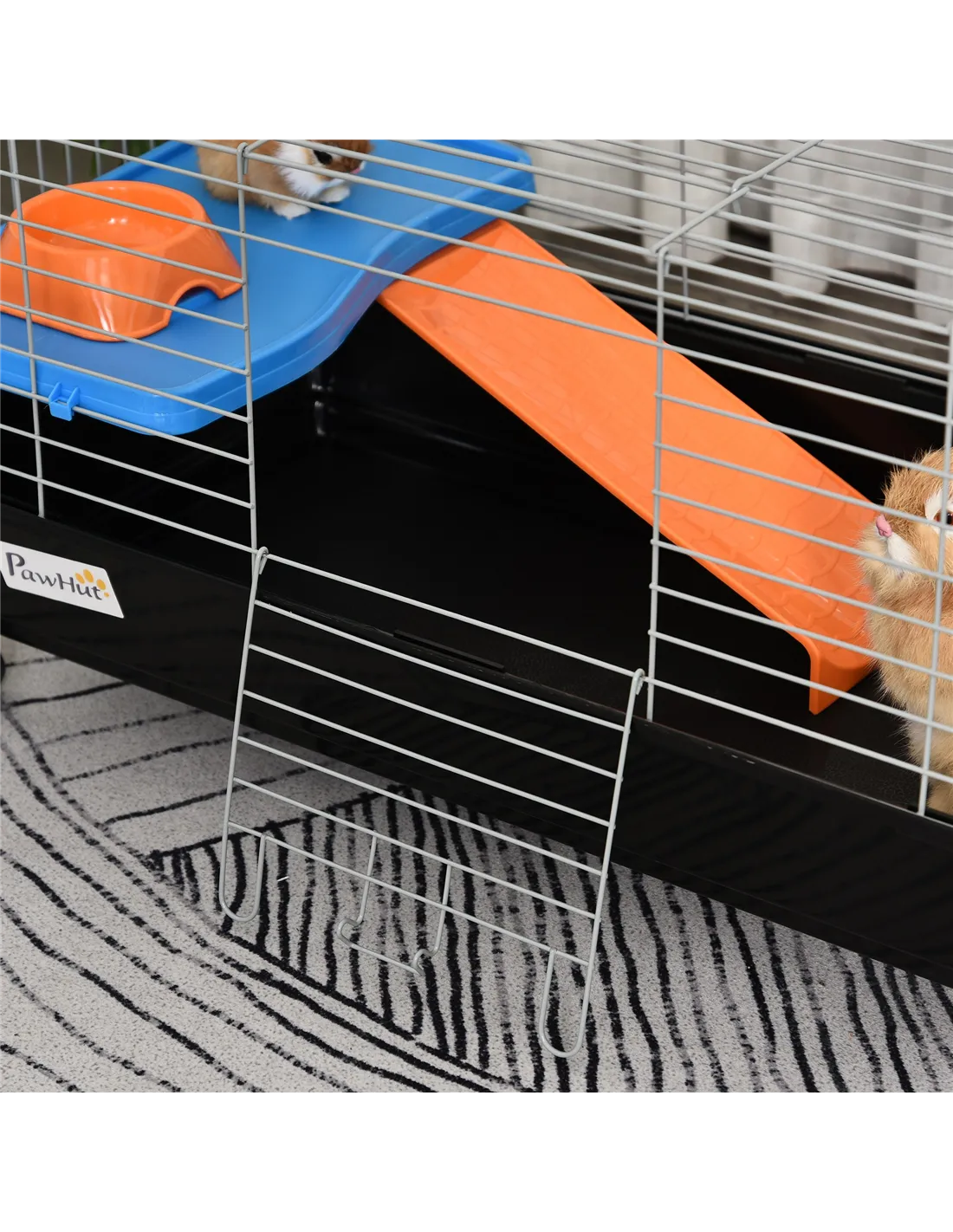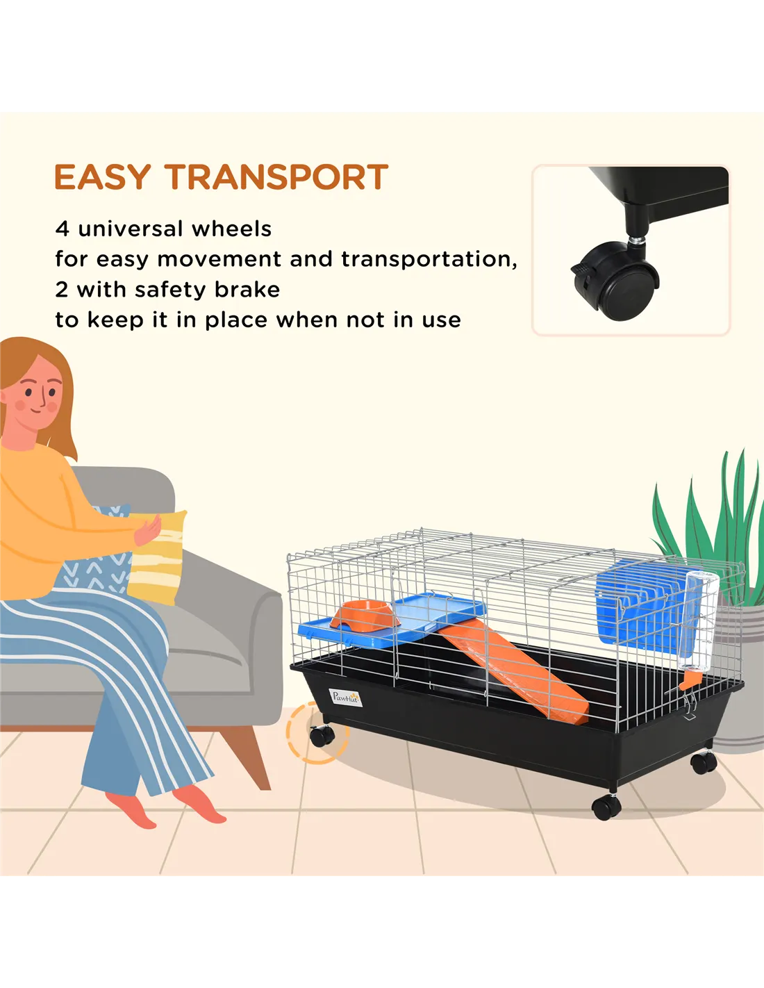 PawHut Small Animal Cage Rabbit Guinea Pigs Chinchillas Cage w/ Wheels Water Bottle Food Dish Platform Ramp 89 x 44 x 43 cm Black