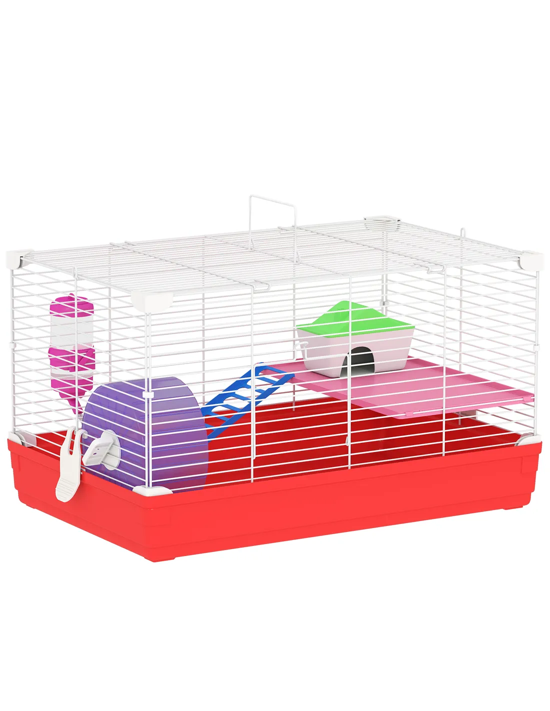 Keep your small pets stimulated, safe and happy with a 2-story, indoor small animal cage kit from PawHut. This animal-friendly design offers multiple platforms for exercise, fun, relaxation, and exploration for your lovely pet. This hamster cage starter kit includes the main habitat, water bottle, food dishes, and exercise wheels. Don't hesitate to buy it!