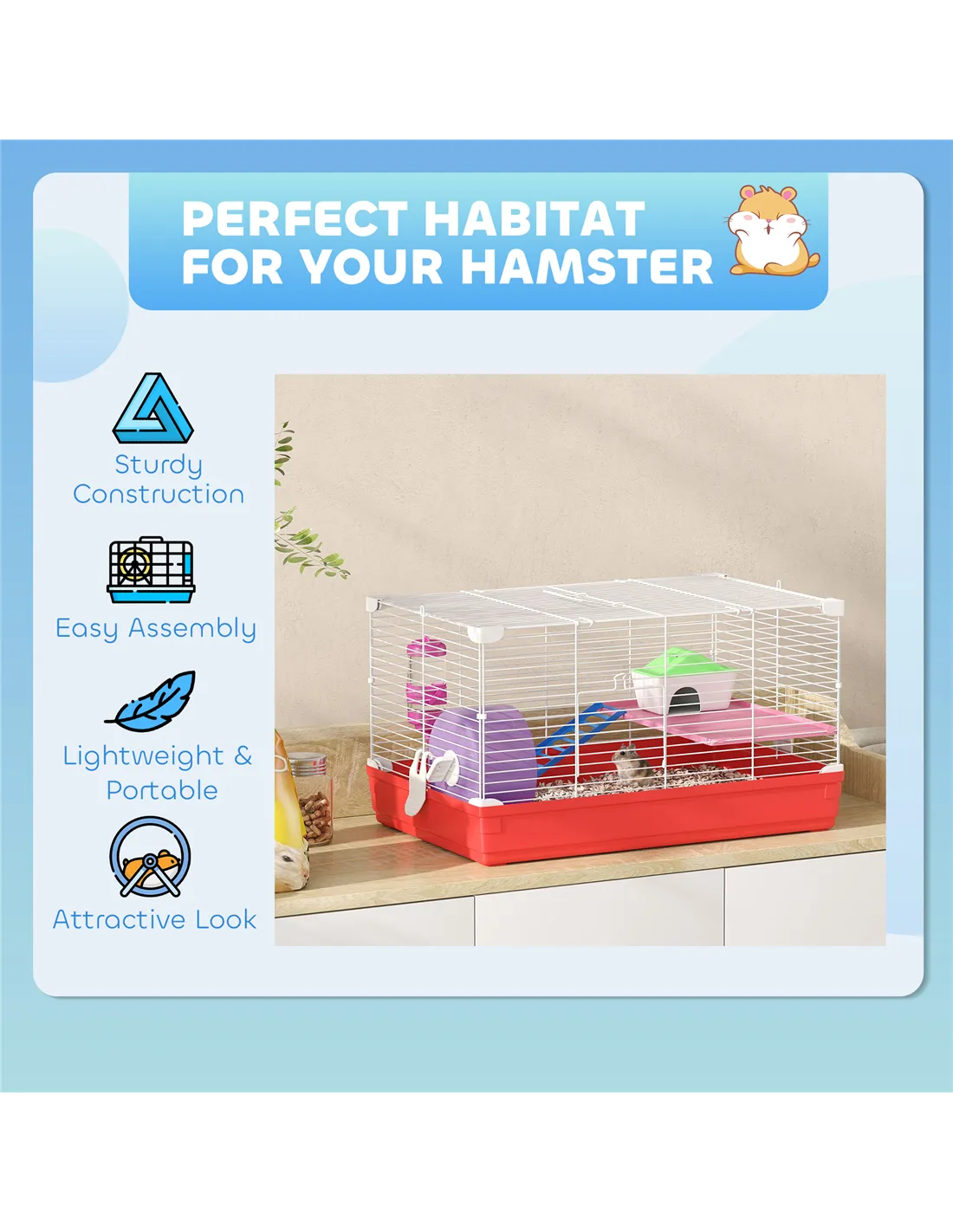 - Ideal for small pets such as dwarf hamsters and gerbils, this compact two-tier habitat fits perfectly in living rooms, bedrooms, or home offices, providing a safe and engaging environment.