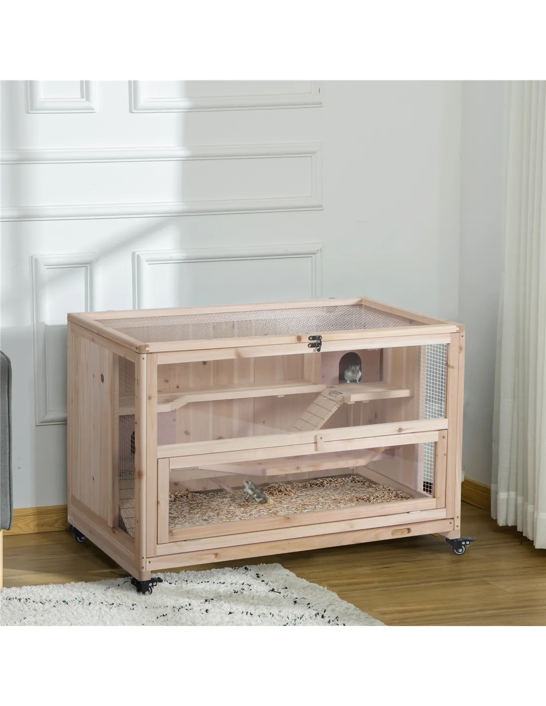 PawHut Wooden Hamster Cage, Mice Rodent Small Animals Kit Hutch, 3 Tiers Exercise Play House, with Wheels, Bottom Tray, 99 x 50 x 69 cm, Natural Wood