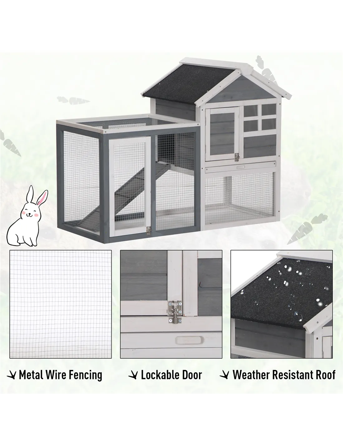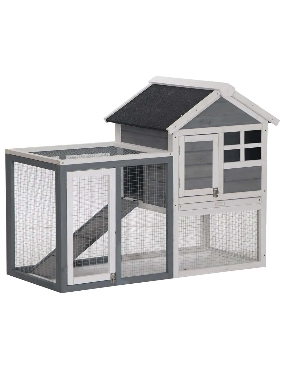 This outdoor rabbit cage from PawHut is perfect for use with rabbits, guinea pigs, and other small animals. This great 2-story rabbit playpen features sturdy construction from Fir wood coated with a water-based preservative to ensure long-lasting use whether used indoors or outside in the elements. This rabbit starter kit hutch has a sturdy steel wire outdoor run for your pets to run around as well as an enclosed space for them to be able to sleep indoors. The outdoor run area accessible by a ramp so your pet can enjoy the outdoors while still being protected from the elements and predators. There are 2 easy to open doors to gain quick access to your pets, one is able to open up the outer run area and the other is to open the inner loft area. The large main living area has a removable pull-out tray to make cleaning simple and quick.
