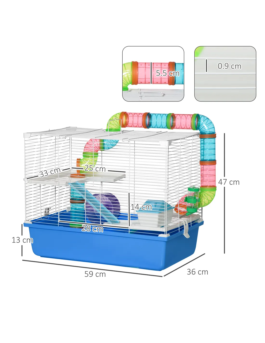 - Dimensions: Without water bottle and tubes: 47H x 59L x 36Wcm. Bottom base: 13H x 59L x 36Wcm. Front door: 14H x 28Wcm. Each perch: 33L x 25Wcm. Hut: 9.5H x 14L x 9.5Wcm. Hut door: 4.7L x 4Wcm. Ramp: 22.5L x 6.5Wcm. Exercise wheel: 8H x Φ13cm. Food dish: 4H x Φ8cm. Water bottle: 75ml