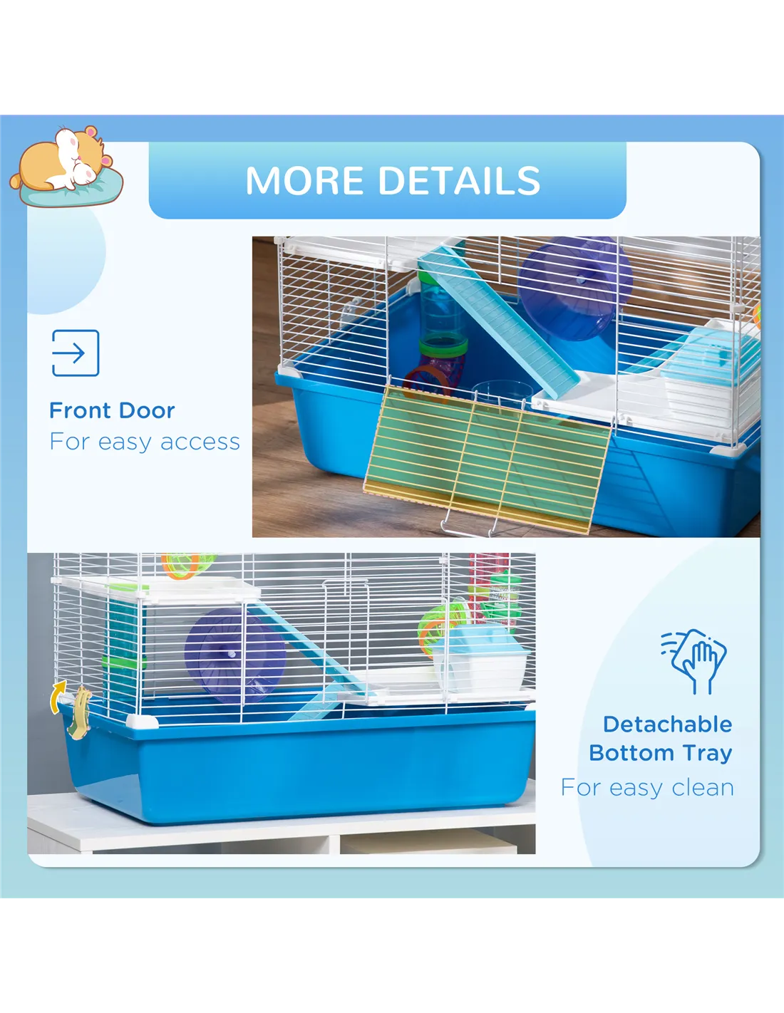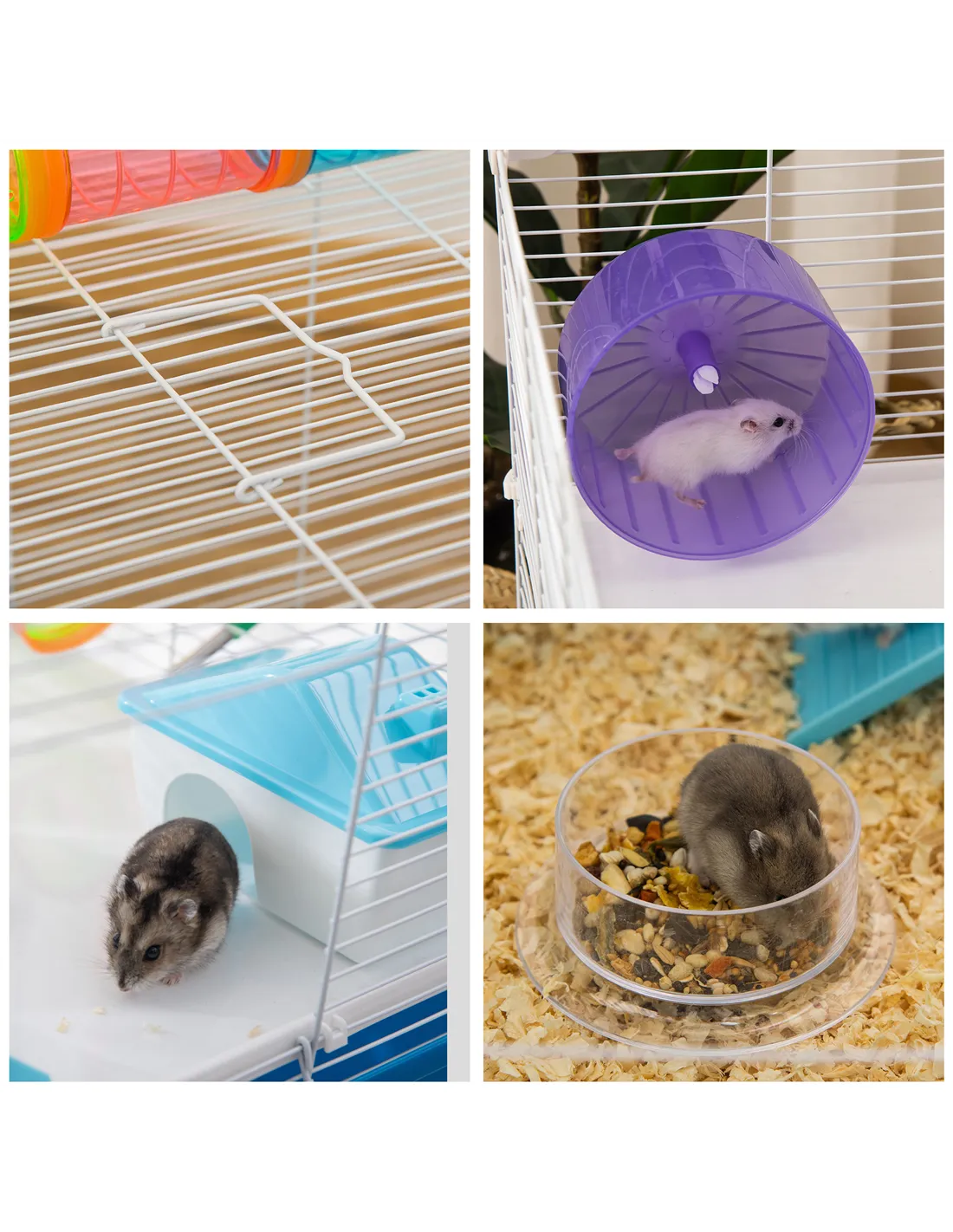 - Accessories: Ramp, exercise wheel, food dish, water bottle, hut, play tubes and platforms